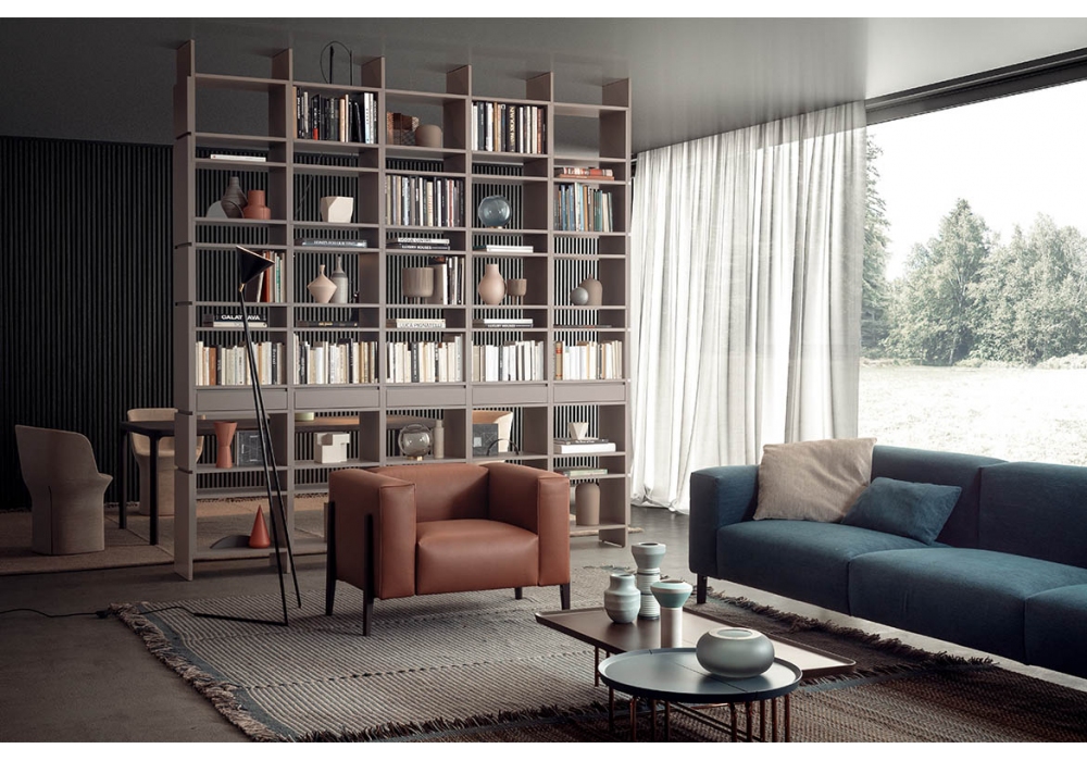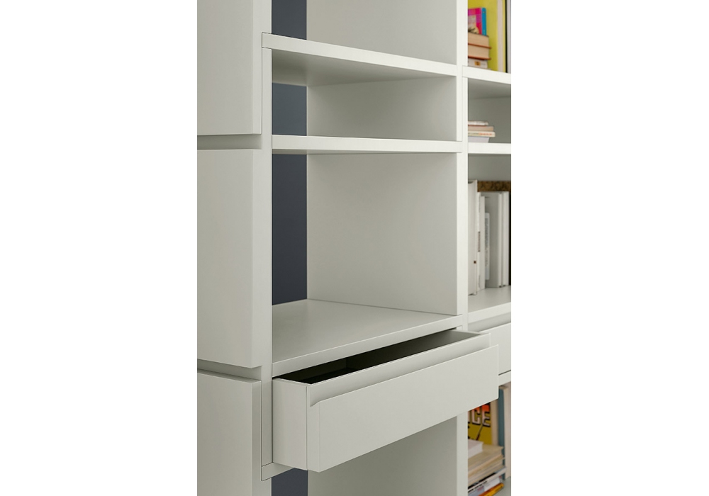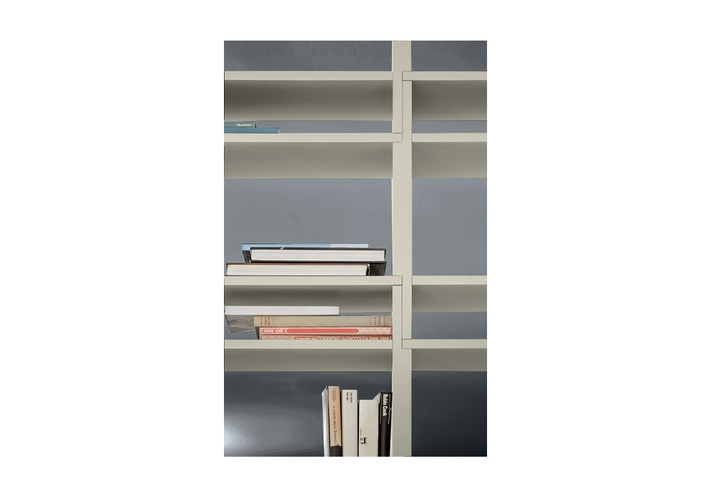 Unless diseñada por Ferruccio Laviani para Pianca es una librería modular realizada con paneles de tableros de partículas revestidos con material sinetético lacado mate o con chapa de madera en acabados Essenza. Posibilidad adicional de alojar pequeños cajones.