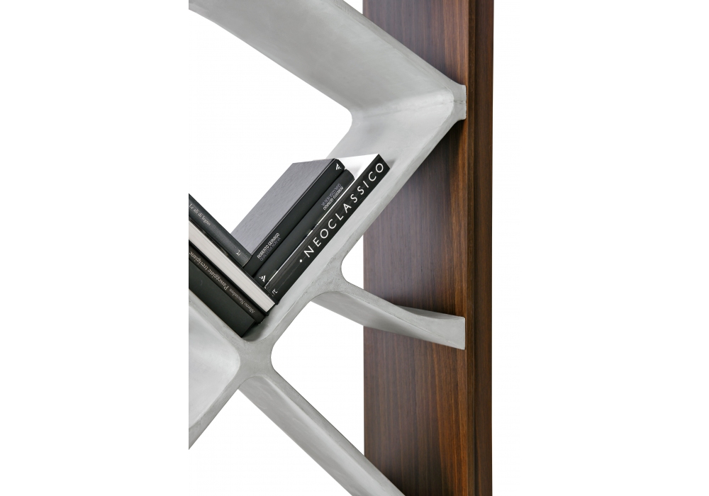 Shanghai diseñada por Giuseppe Bavuso para Alivar es una librería realizada con estructura externa en roble tratado térmicamente o teñido de negro o en MDF lacado. Estructura interna en Baydur estructural expandido obtenido mediante molde de acero, revestido en hormigón espatulado gris o lacado mate.