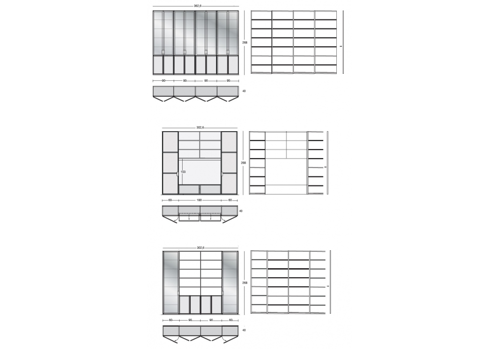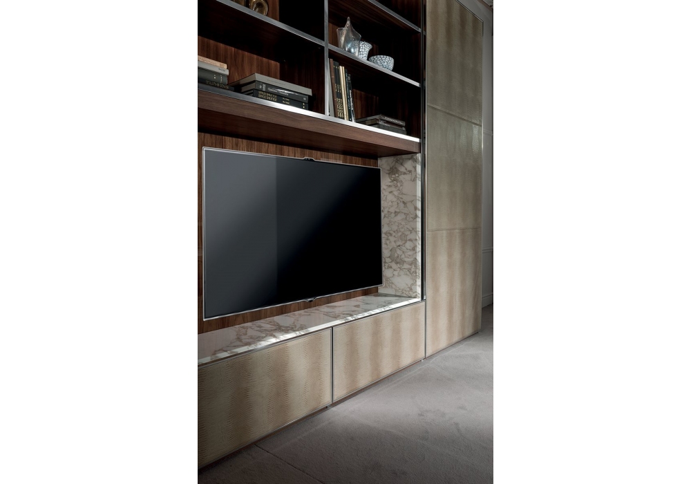 Ianus Middle diseñado por Alessandro La Spada es una pared equipada modular con estructura en madera contrachapada, bordes y perfiles en aluminio anodizado y estantes en esencia de madera, revestidos en cuero o vidrio. Los frentes de los cajones están cubiertos de cuero. El sistema cuenta con un módulo especial personalizable de 180 cm para TV.