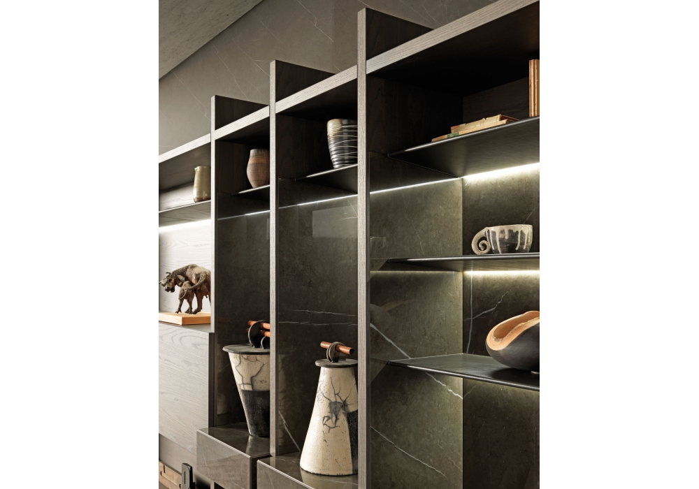 Over diseñado por Castiglia Associati para MisuraEmme es un sistema de dia modular con columnas que se pueden colocar una al lado de la otra en 7 anchos y 2 alturas. Caracterizado por respaldos en varios acabados, apilables mediante perfiles de aluminio, patentados por MisuraEmme, con sistema de electrificación oculto integrado. La libertad compositiva permite diseñar luces más amplias hasta 220 cm, geometrías asimétricas capaces de aligerar la percepción visual. La boiserie horizontal electrificada crea un sistema de iluminación integrado. El toque extra y la verdadera personalización del producto son los acabados: esencias, vidrio, cuero, tecno-metal y tecno-mármol se combinan en un equilibrio excepcional de materiales y colores.