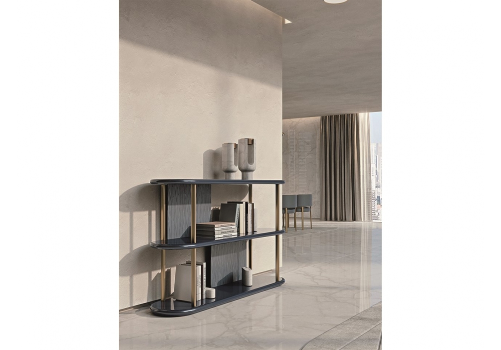 Roma diseñada por Monica Armani para Turri es una librería con estructura en MDF y contrachapado en acabado lacado brillo con revestimiento en diferentes pieles con bordados. Piezas metálicas en dos acabados. Disponible en diferentes dimensiones.