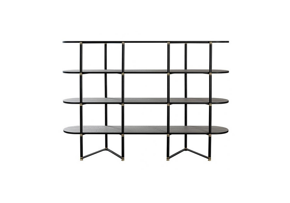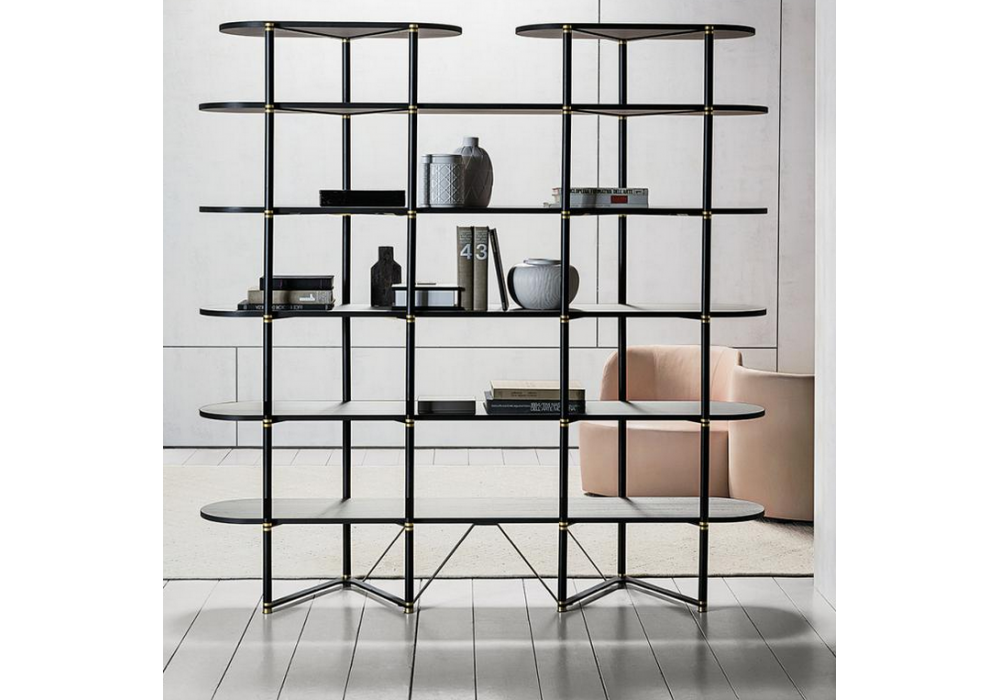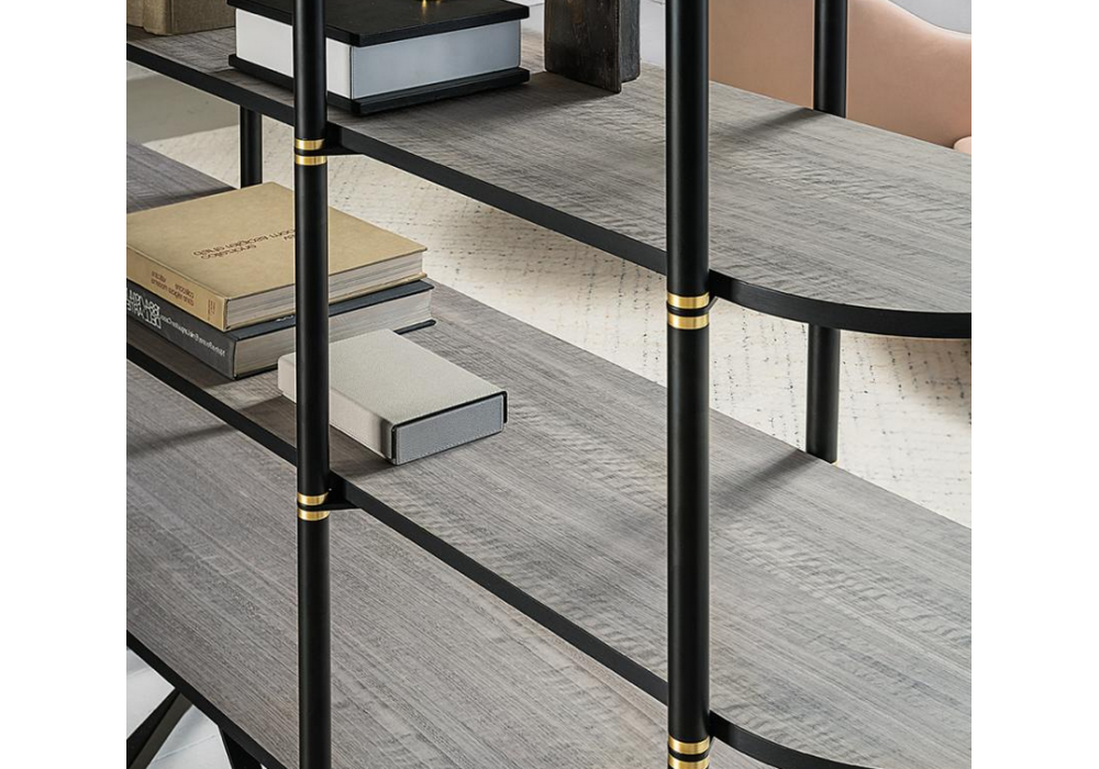 Boomerang diseñada por Pietro Russo para Casamilano es una librería con estructura compuesta por pequeños tubos de metal pintado de negro superpuestos entre sí y espaciados por vasos de latón. Los estantes están realizados con tableros de partículas revestidos en esencia o lacados.