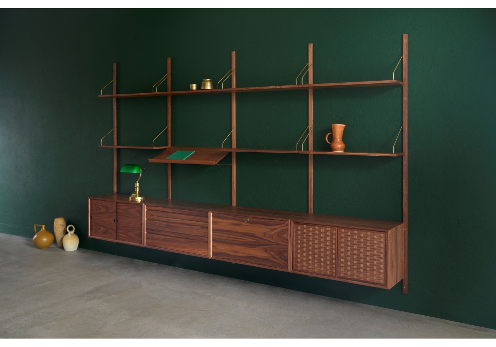 Royal System diseñado por Poul Cadovius para Dk3 es un sistema modular realizado en MDF y madera maciza, colgadores y soportes para estantes en acero inoxidable o latón. Disponible en diferentes acabados y múltiples configuraciones.