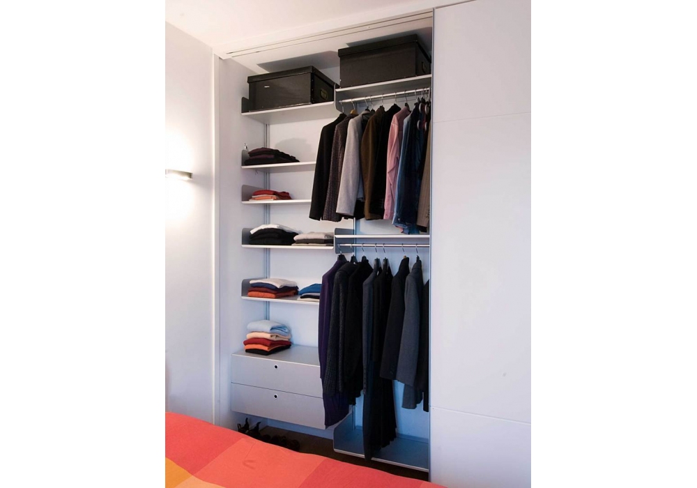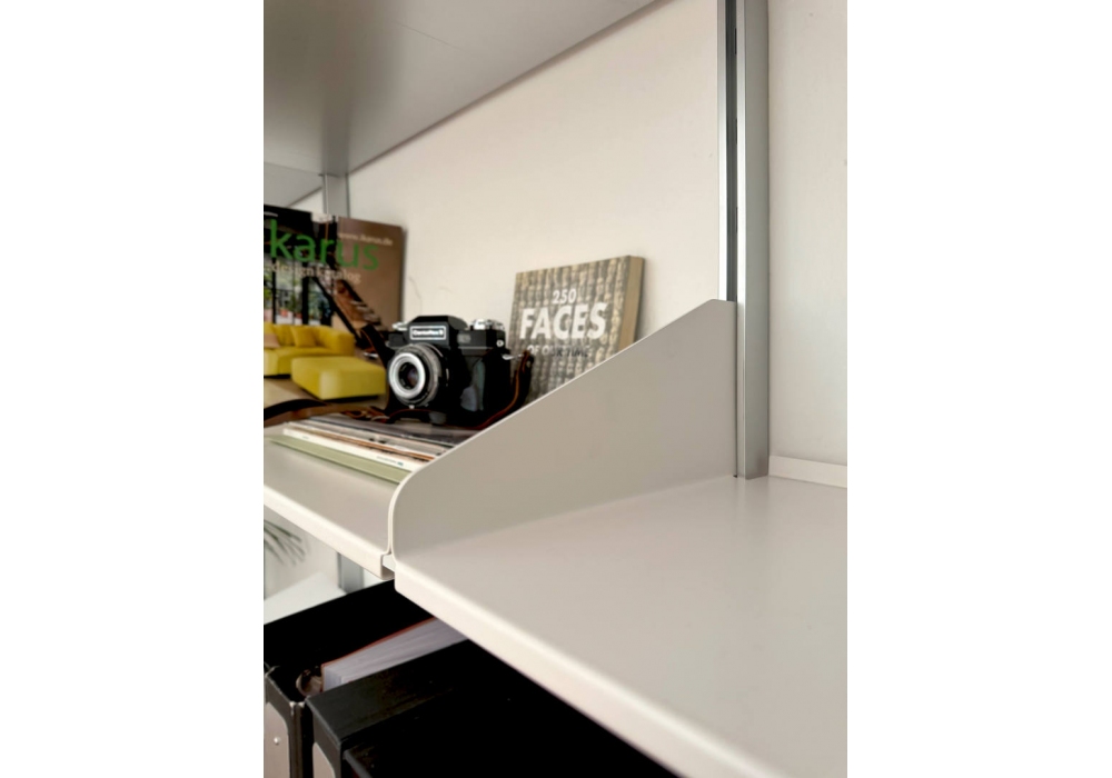 K1 diseñado por Kriptonite es un sistema de pared íntegramente realizado en aluminio. Los montantes, corazón estructural del sistema, permiten elegir libremente la posición de los elementos (estanterías, accesorios y contenedores) para adaptar la librería a sus necesidades de espacio y dimensiones. La variedad de medidas disponibles, los 5 acabados de colores RAL diferentes y las dos esencias de madera, roble y nogal canaletto, hacen de K1 un sistema de decoración capaz de interpretar cualquier ambiente, tanto doméstico como profesional.