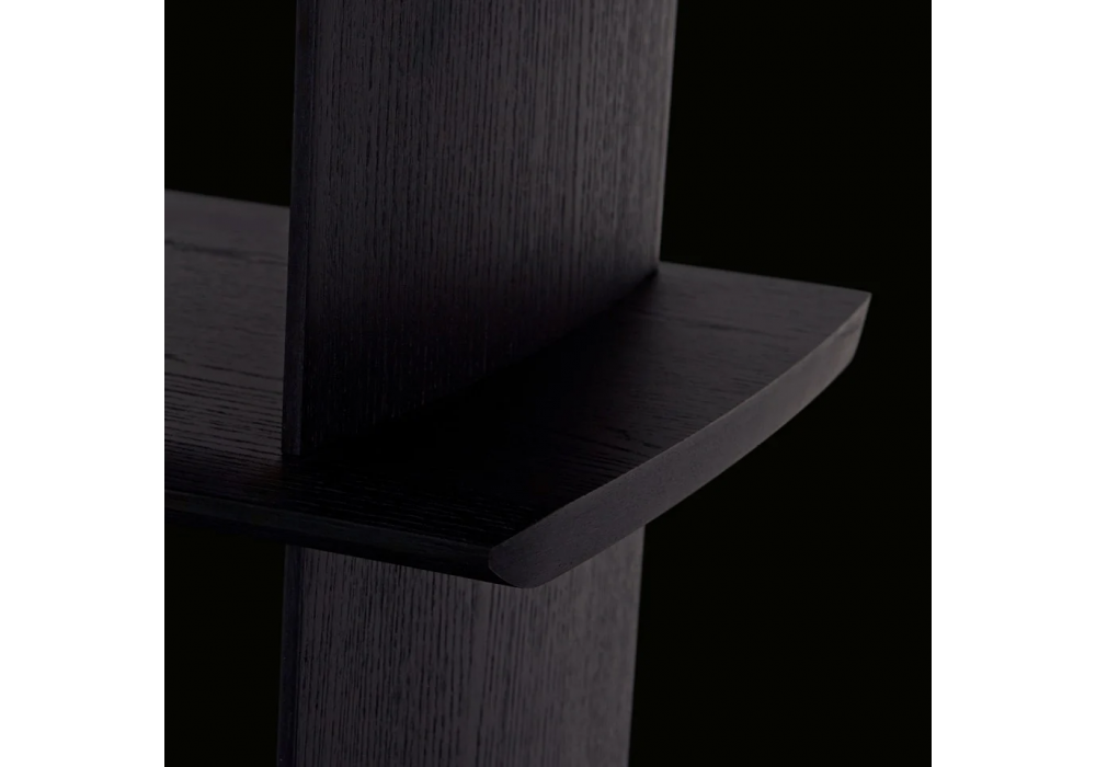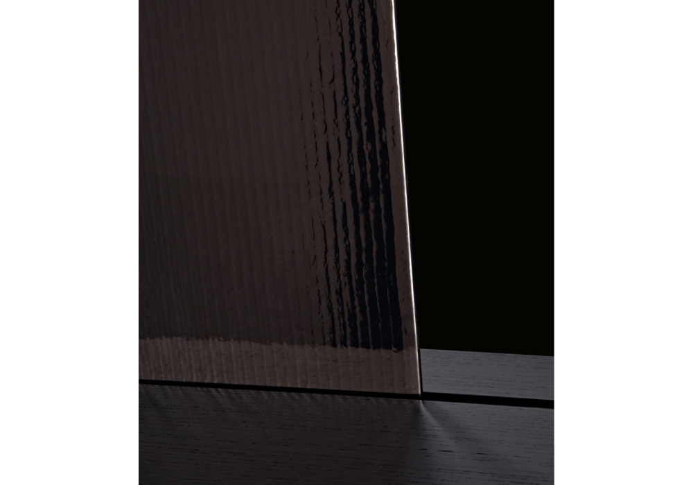 Tess diseñada por Jean-Marie Massaud para Poliform es una librería con estructura de tablero de fibra de densidad media chapado en olmo negro y paneles traseros deslizantes de cristal fumé o bronce rayado. Cajas opcionales en colores cuero.