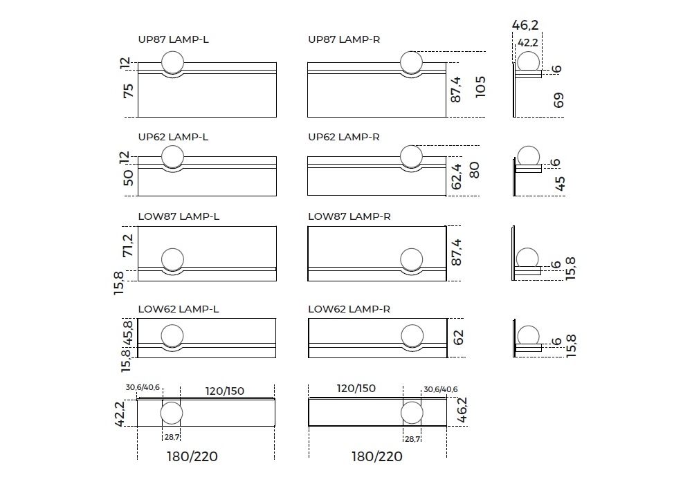 Stresa diseñado por Dainelli Studio para Gallotti&Radice es un estante con panel de boiserie en madera teñida poro abierto negro, teñida poro abierto tabaco o teñida poro abierto blanco "Pure". Panel para fijar a la pared. Estante de madera recubierto de cuero ruborizado según muestras. Disponible posicionado en la parte superior o inferior del panel, a especificar en el momento del pedido. Lámpara de cristal opalino opaco diam. 35 posicionado en el estante. (Bombilla E27 suministrada). Disponible versión derecha o izquierda a especificar en el momento del pedido. Luz activada por un sensor táctil colocado debajo del estante. Perfiles metálicos en níquel satinado y soporte de esfera.