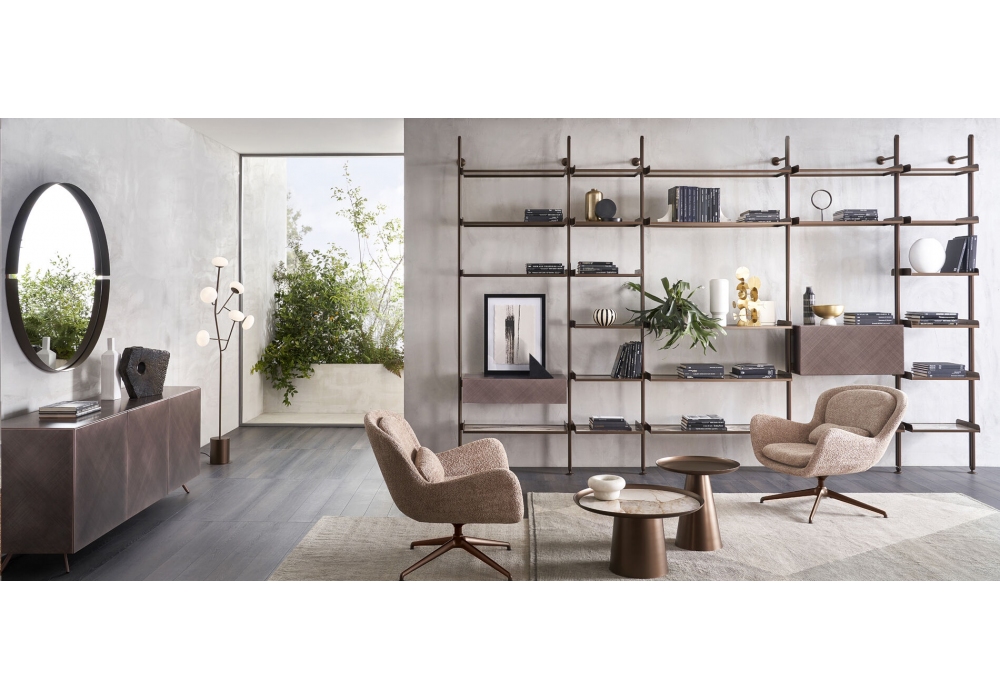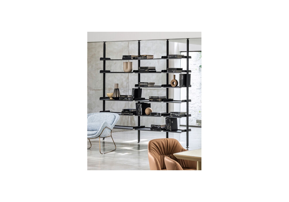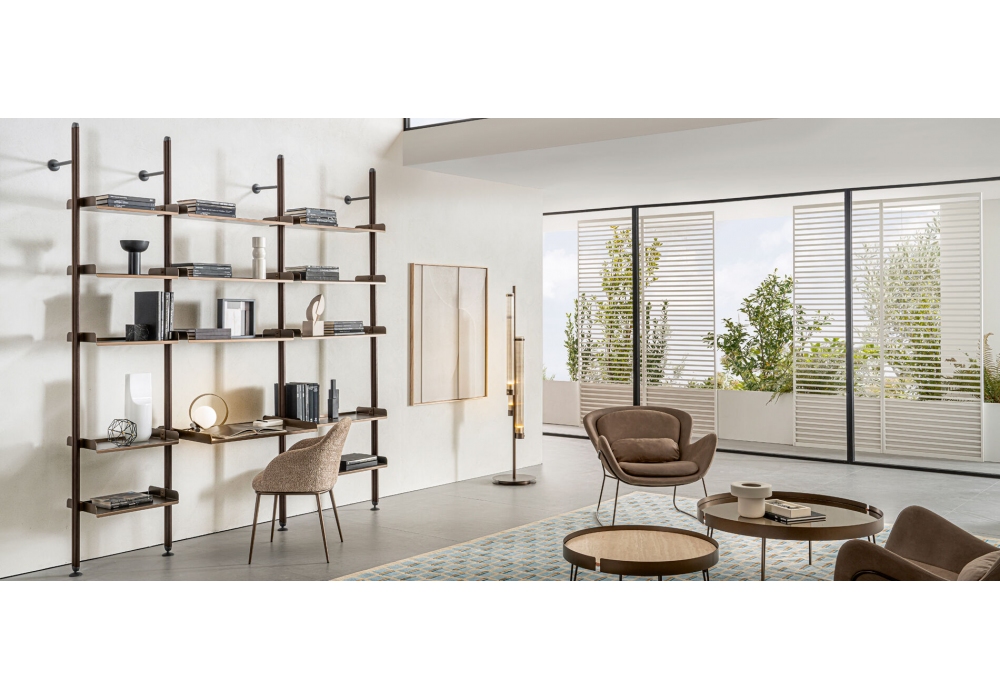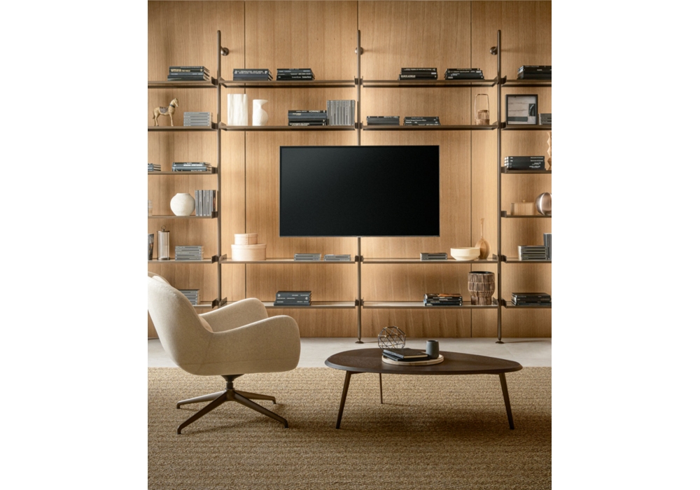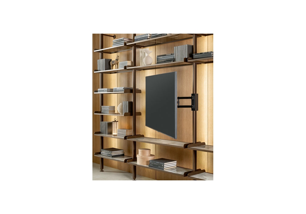 Techwall diseñada por Riflessi es una librería multifuncional con un diseño esencial y sofisticado, diseñada para amueblar, dividir y realzar espacios sin cerrarlos. Modular, personalizable e infinitamente reconfigurable, combina una estructura ligera y refinada de aluminio con estantes de vidrio o cerámica y contenedores de madera lacada. Instalable en la pared o el techo, se adapta perfectamente a cualquier entorno, incluso con soluciones personalizadas. Las características opcionales incluyen el brazo ajustable para TV y la iluminación LED integrada.