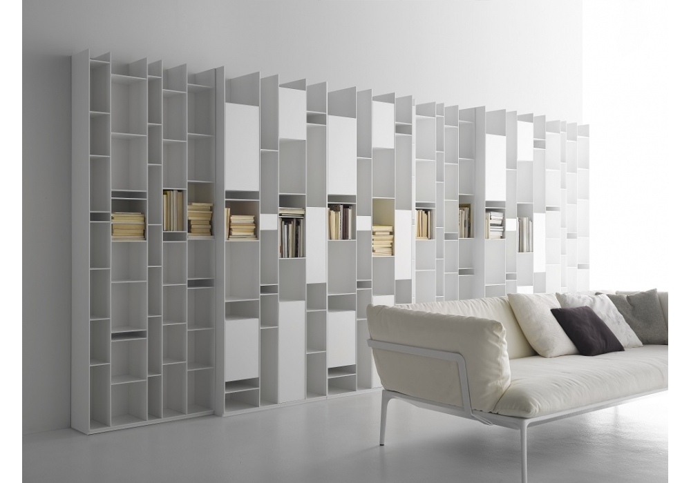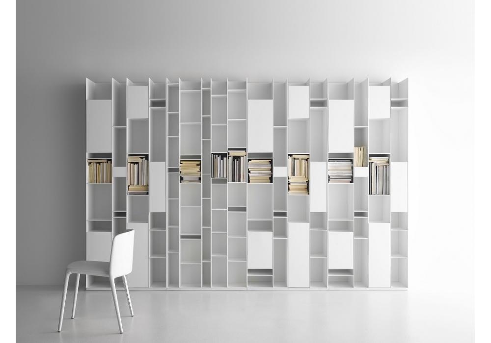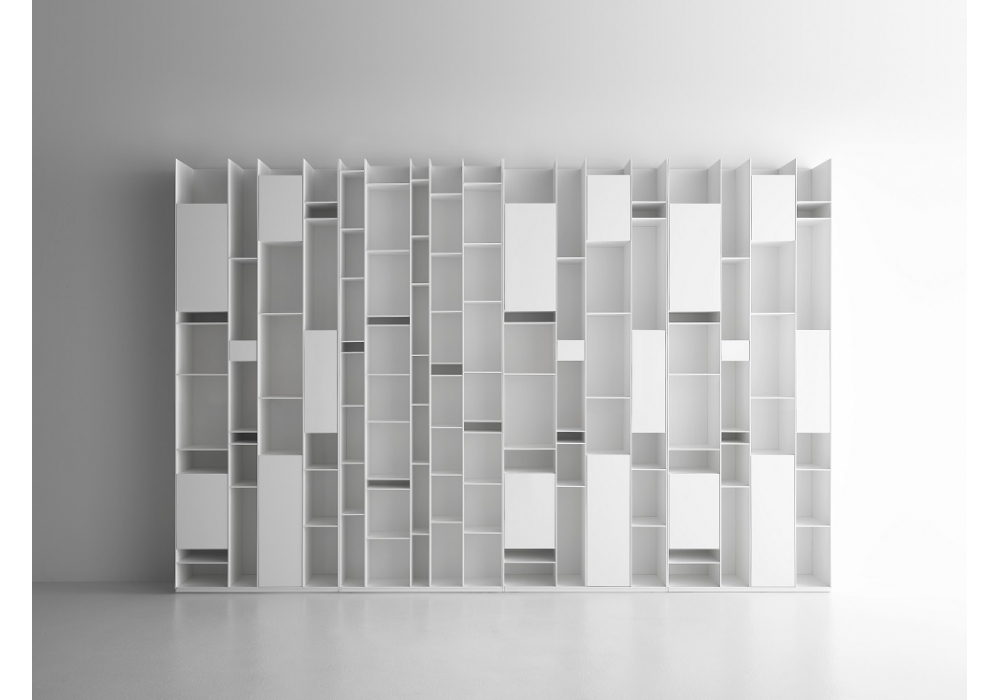 Random Box diseñada por Neuland Industriedesign para MDF Italia es una librería con compartimentos cerrados por puertas, realizada con paneles de fibra de madera de densidad media lacados mate en color blanco (microgofrado).