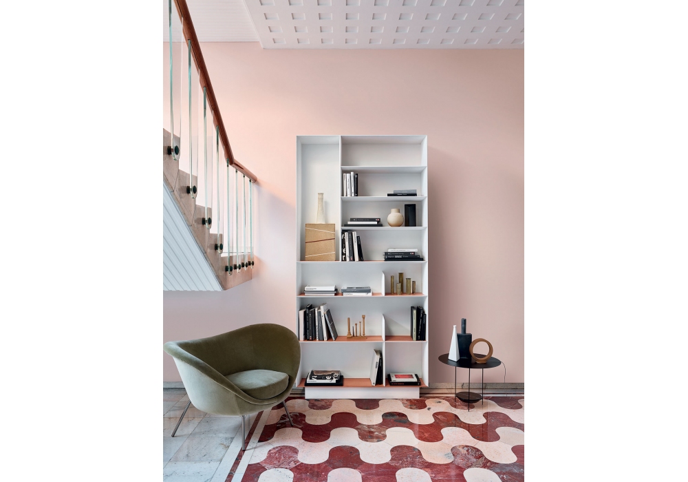 D.357.1 diseñada por Gio Ponti para Molteni&C es una librería realizada en madera contrachapada perfilada con revestimiento de olmo, en parte con acabado transparente natural, en parte pintada a mano en blanco. Está disponible en la versión con o sin espejo aplicado.