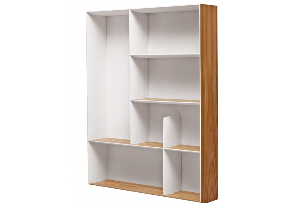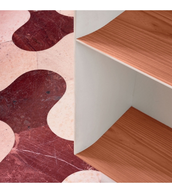 D.357.2 diseñada por Gio Ponti para Molteni&C es una librería realizada en madera contrachapada perfilada con revestimiento de olmo, en parte con acabado transparente natural, en parte pintada a mano en blanco. Está disponible en la versión con o sin espejo aplicado.