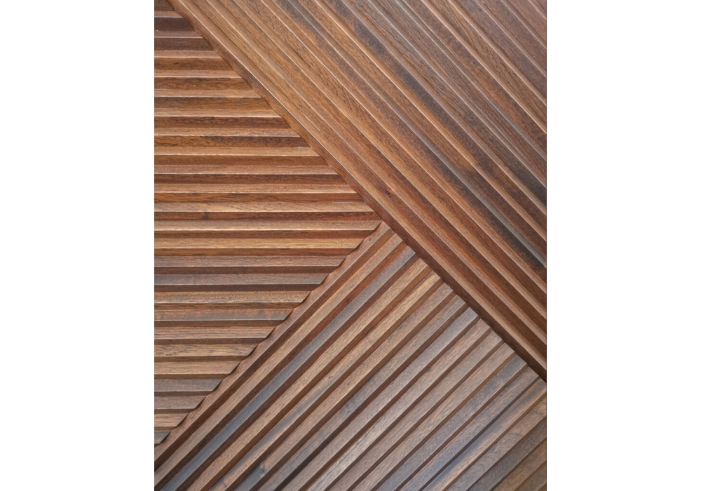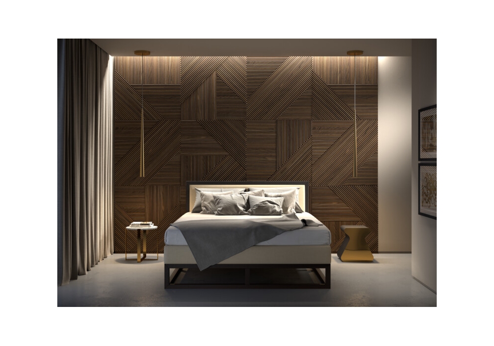 Stripes Boiserie diseñado por Elena Pancaldi para Emmemobili es un sistema modular (90xH.90 cm) con diferentes decoraciones realizadas con perfiles triangulares de madera maciza, colocados uno al lado del otro y aplicados manualmente sobre paneles enchapados.