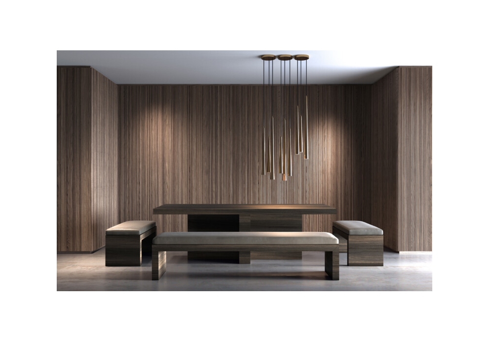 Stripline Boiserie diseñado por Emmemobili es un sistema modular (60xH270 cm) de paneles con perfiles triangulares de madera maciza, colocados uno al lado del otro y aplicados manualmente sobre paneles enchapados.
