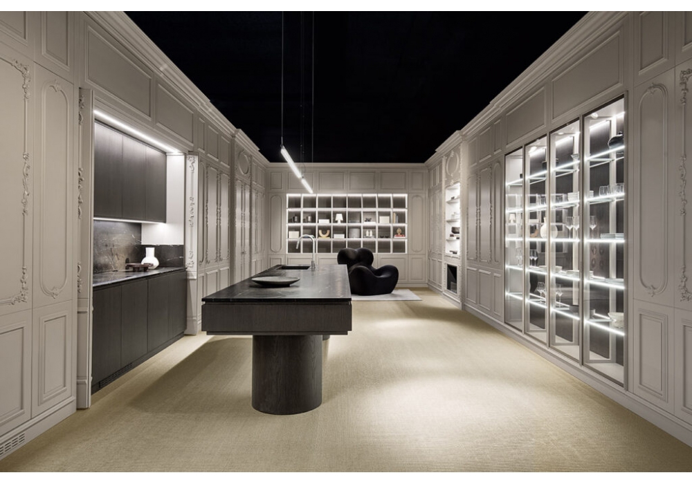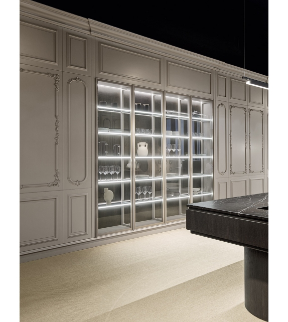 Floral Botanica diseñada por makethatstudio para L'Ottocento es una boiserie de madera que reviste el área de la cocina con un sistema de pared versátil y completamente equipado. Se estructura de forma personalizada, con puertas empotradas o extraíbles, baldas y compartimentos abiertos o cerrados, en función de las necesidades y destino de los espacios. También puede incluir puertas de paso, que quedan así integradas en la boiserie.