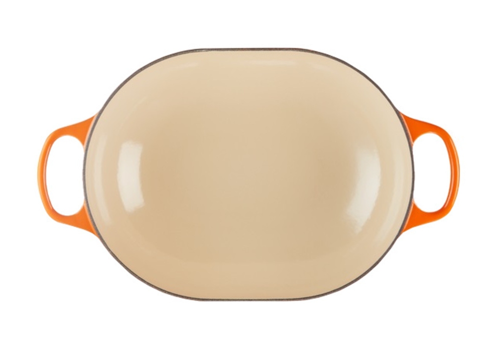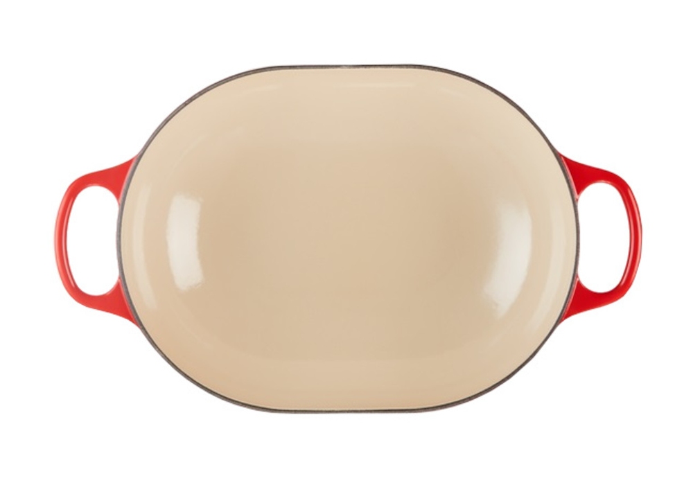 Oblong Evolution 31 diseñada por Le Creuset es una cazuela de hierro fundido disponible en diferentes colores. Acabado interior blanco a excepción de la cazuela negra que tiene interior negro.