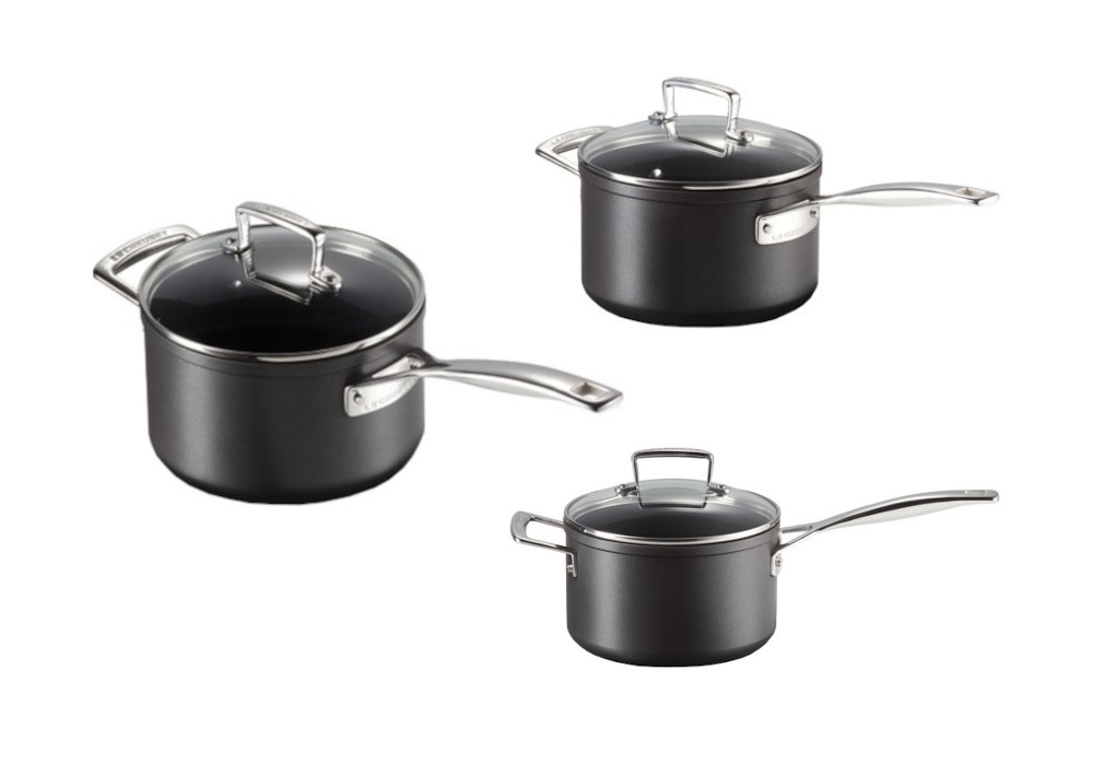 Batteria 3 Casseruole diseñada por Le Creuset es un conjunto de 3 cazuelas de aluminio antiadherentes con asa larga, asa y tapa.