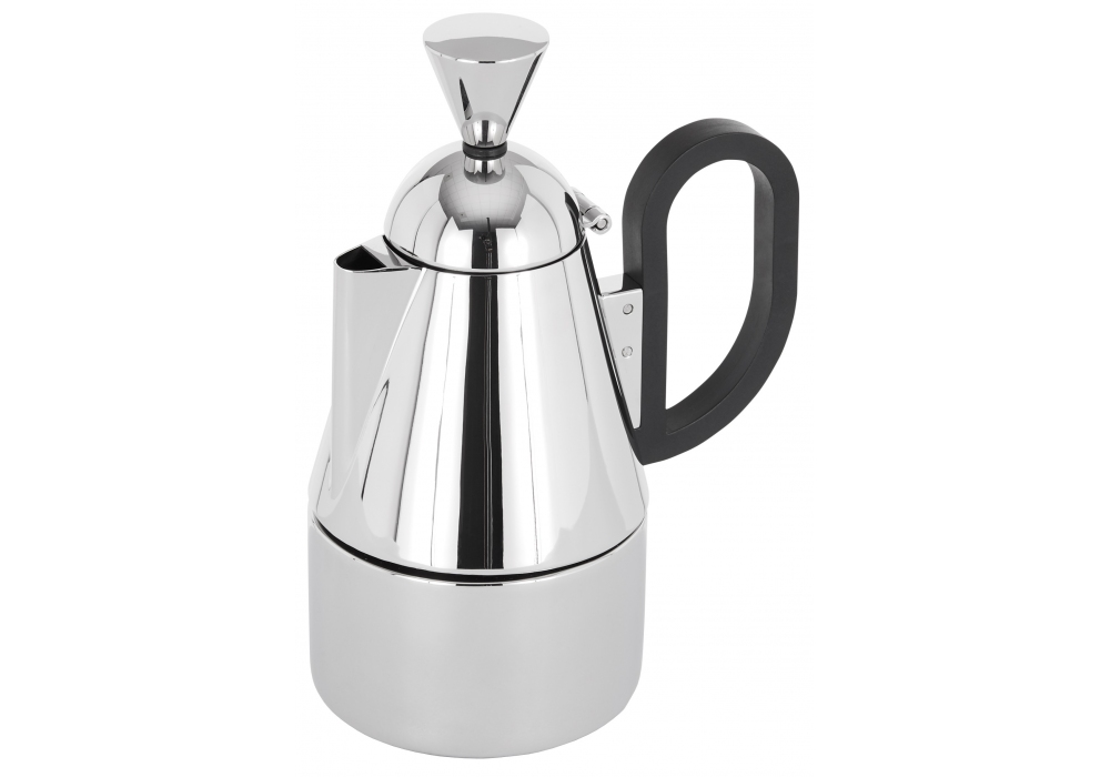 Brew diseñada por Tom Dixon es una cafetera fabricada en acero inoxidable con un acabado plateado brillante.