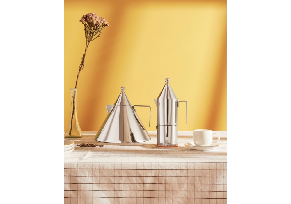 La Conica diseñada por Aldo Rossi para Alessi es una cafetera para café exprés realizada en acero inoxidable 18/10 con fondo en cobre. Disponible en 3 o 6 tazas.
