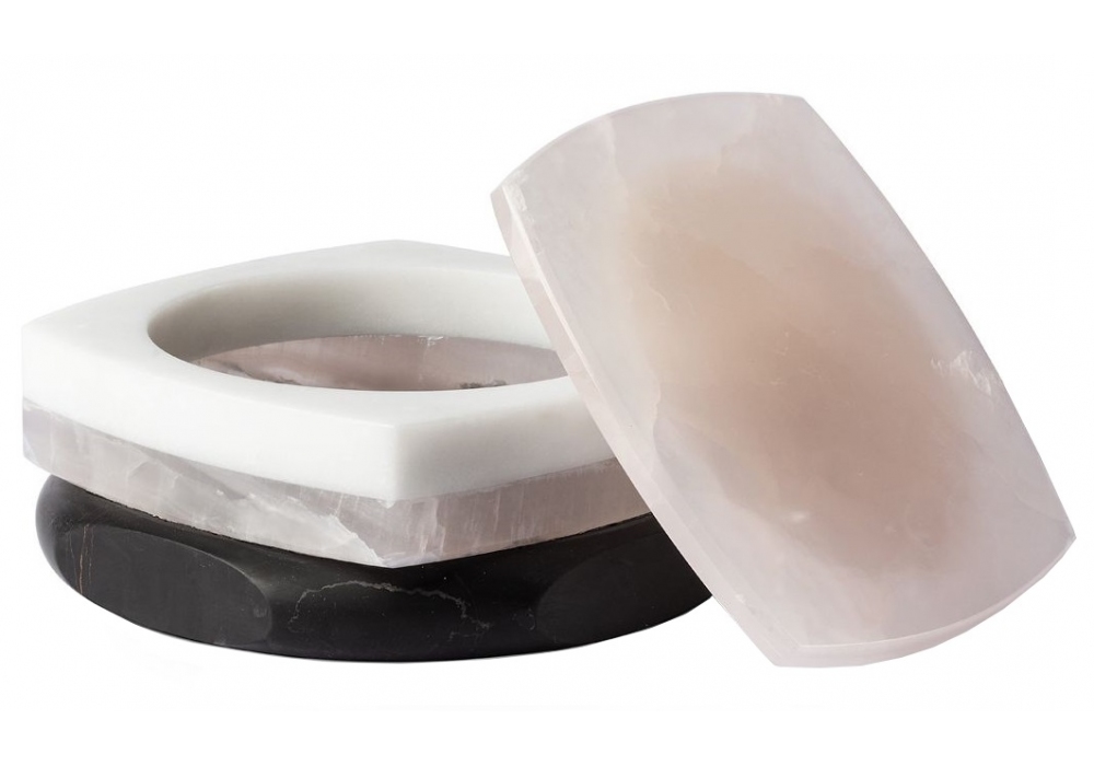 Coco diseñado por Cristina Celestino para Budri es un joyero realizado en mármol Nero Marquinia, Bianco Statuario y Onice Rosa. La tapa es de ónix rosado.