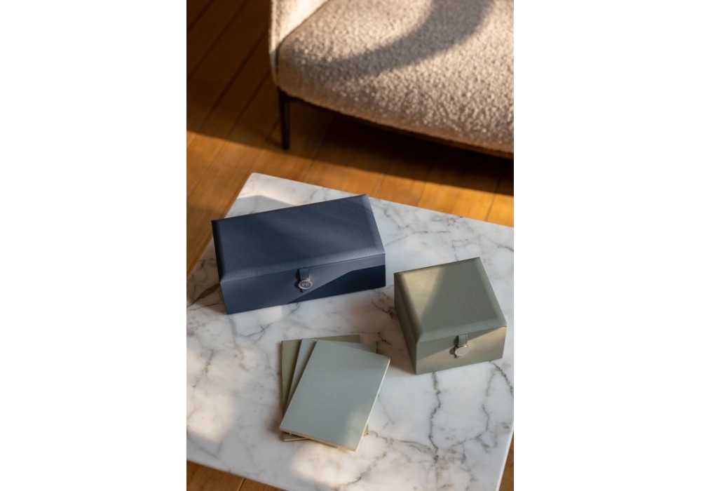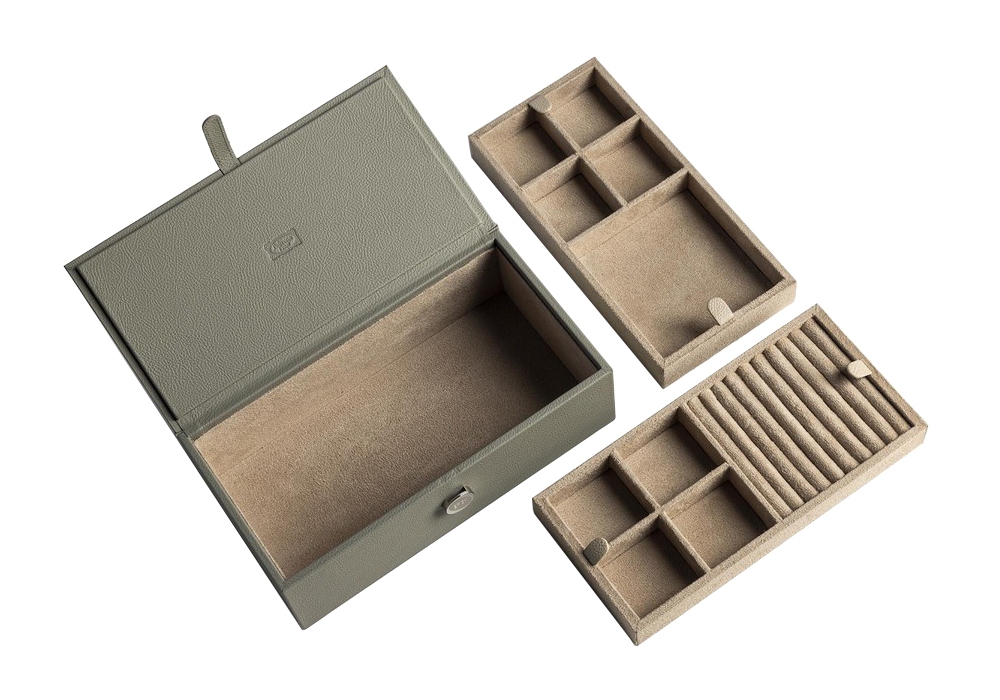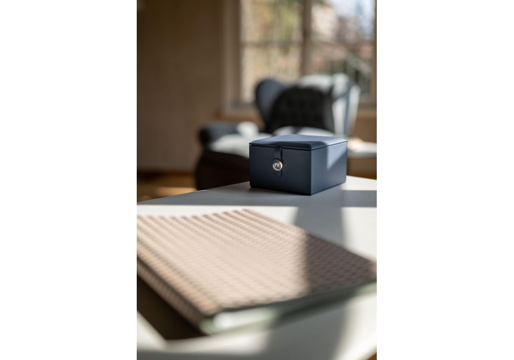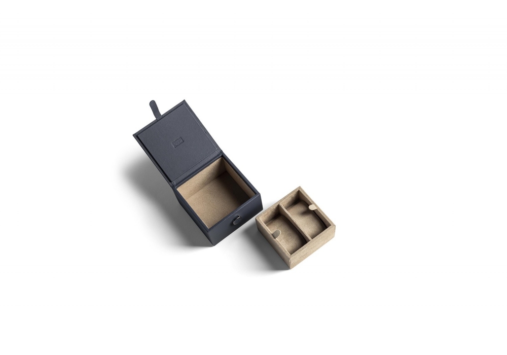 El joyero está tapizado en piel Pelle Frau® ColorSphere® SC 173 Glauco, mientras que la caja del reloj está tapizada en piel Pelle Frau® ColorSphere® SC 279 Alchemy.