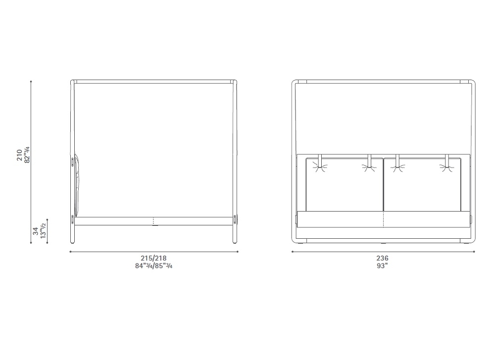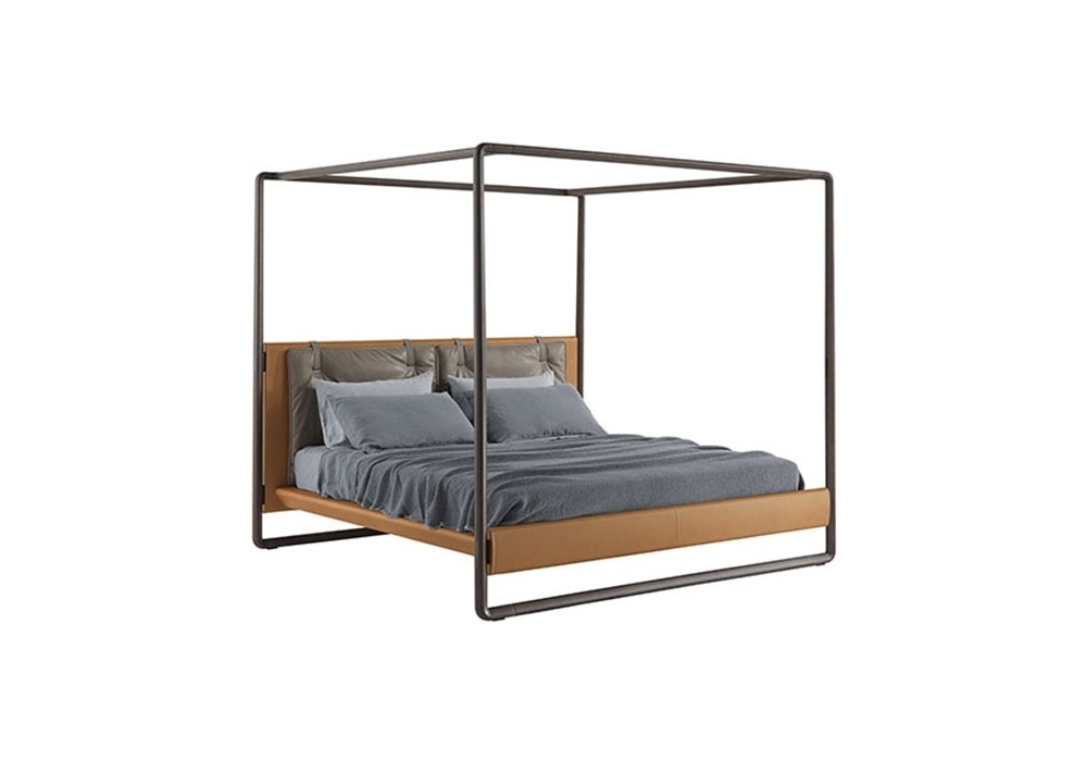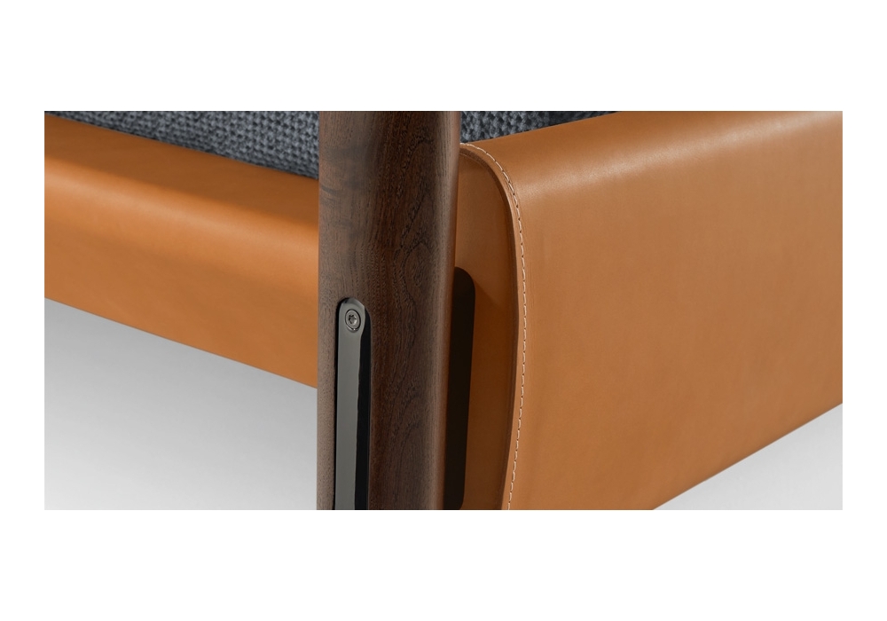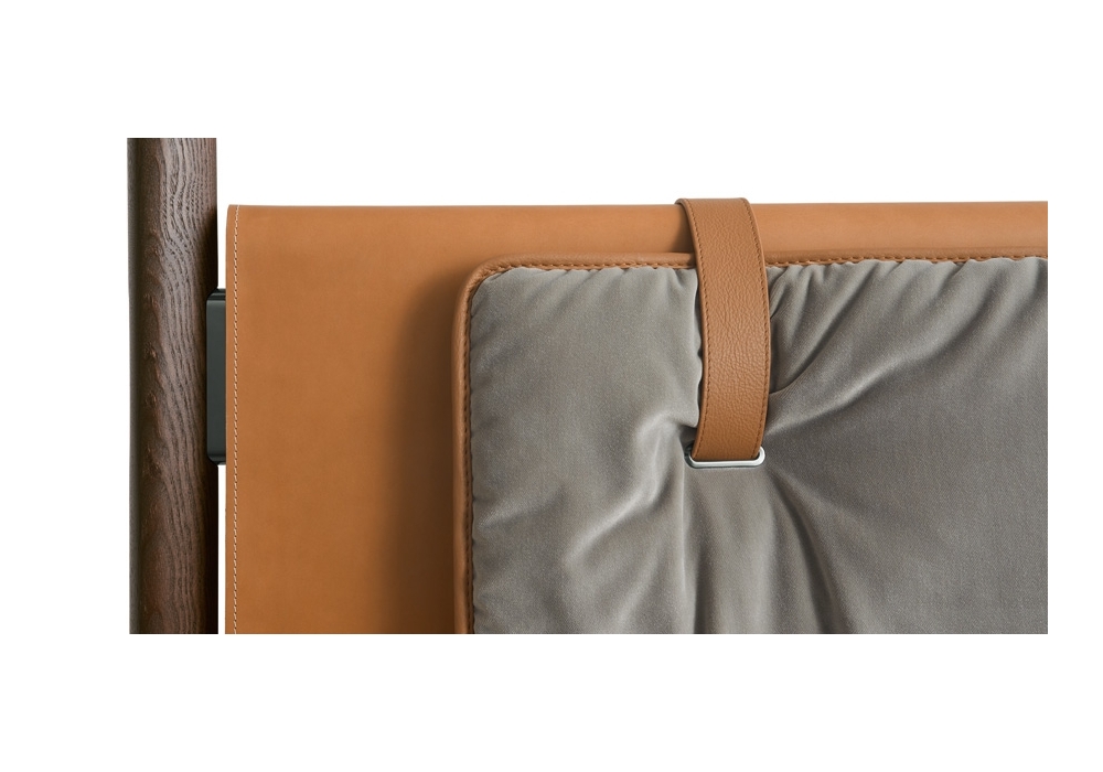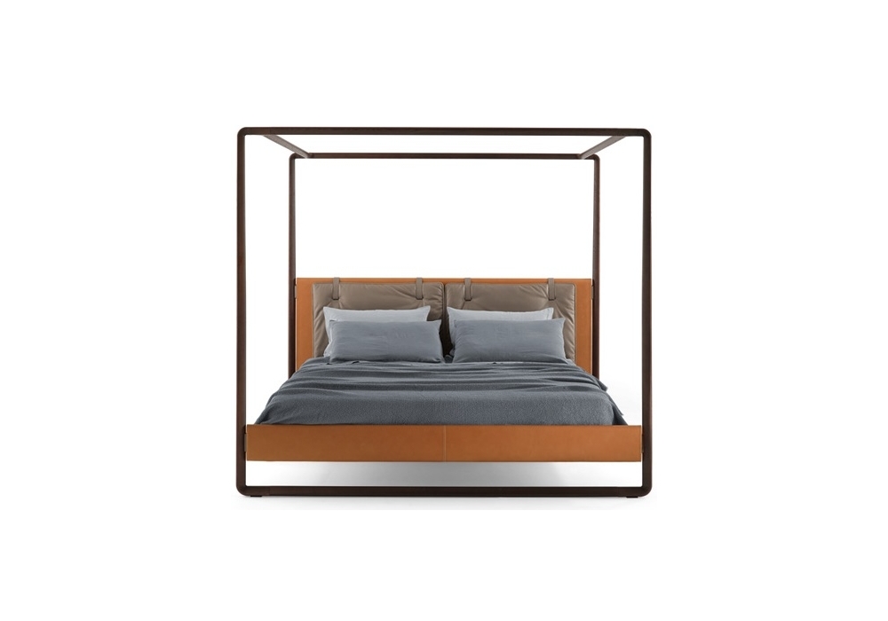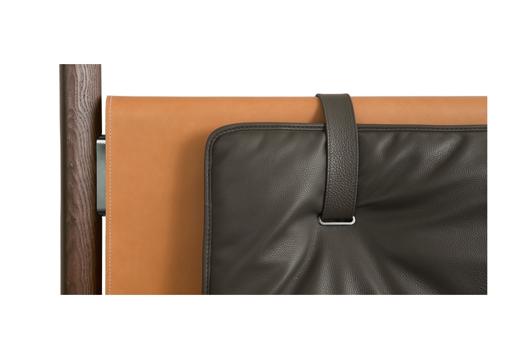 Volare is a bed designed by Roberto Lazzeroni for Poltrona Frau. The triangular profile solid ash wood four-poster structure gradually thins and lights towards the top. The nocturnal and elegant moka finish on the ash combines perfectly with the natural, vibrant tones of the leather that cover the other elements. The footboard and bed frame boards are in tulipwood, entirely upholstered in Cuoio Saddle Extra or Pelle Frau® leather, as is the beech and birch plywood headboard. Two soft and sumptuous pillows, padded in polyester wadding, are attached to the headboard with two belts made from Pelle Frau® or Saddle Extra leather. The upholstery is in Pelle Frau® leather or fabric, always refined with a trim around the edge.