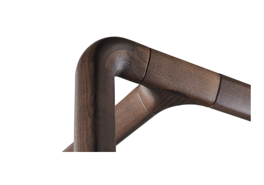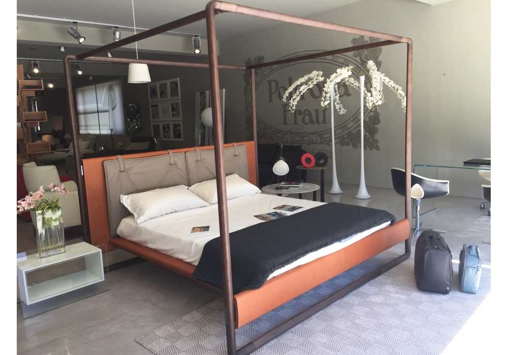 Volare is a bed designed by Roberto Lazzeroni for Poltrona Frau. The triangular profile solid ash wood four-poster structure gradually thins and lights towards the top. The nocturnal and elegant moka finish on the ash combines perfectly with the natural, vibrant tones of the leather that cover the other elements.