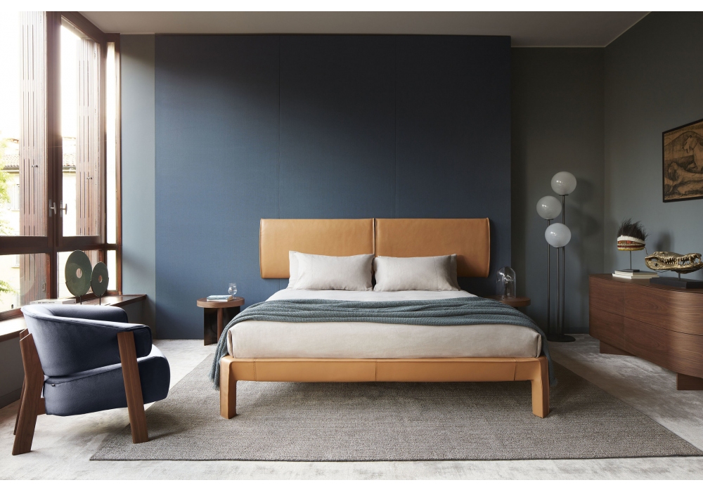 L50 Cab Night, designed by Mario Bellini for Cassina, is a bed with padded headboard, bed frame and legs covered in soft and thick leather and rigid leather in seven shades: black, Bulgarian red, natural, taupe, blue. The bed is available in versions with fixed or wall-mounted headboard. Structure in poplar plywood and solid beech, headboard padding in polyurethane foam.