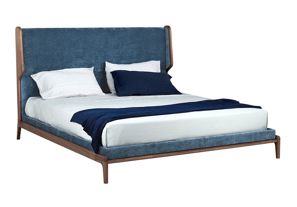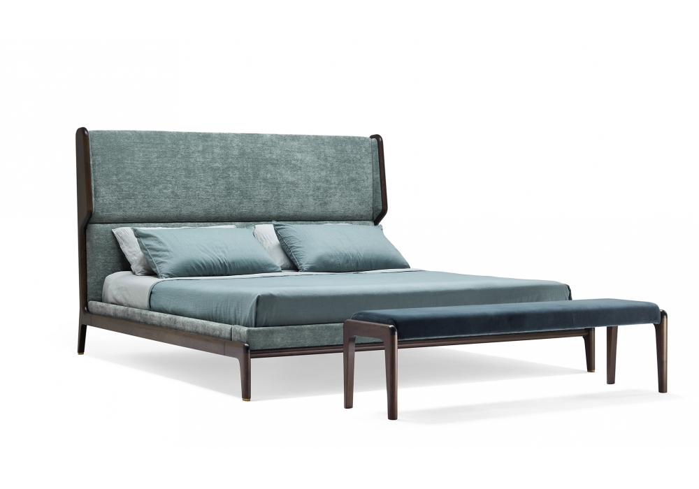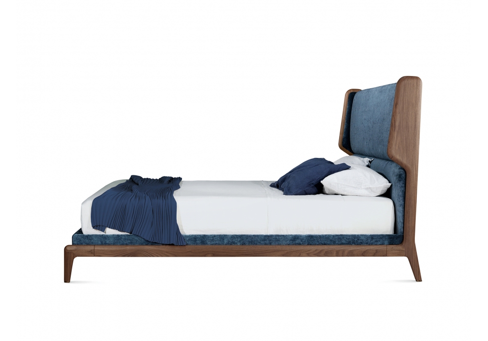 Sleeping Muse, designed by Roberto Lazzeronifor Ceccotti Collezioni, is a bed made in solid American walnut, bed base in veneered plywood, upholstered headboard and bed fascia, covered in fabric or leather.