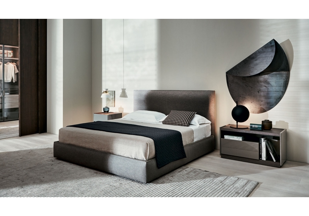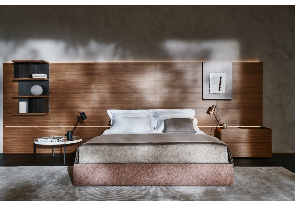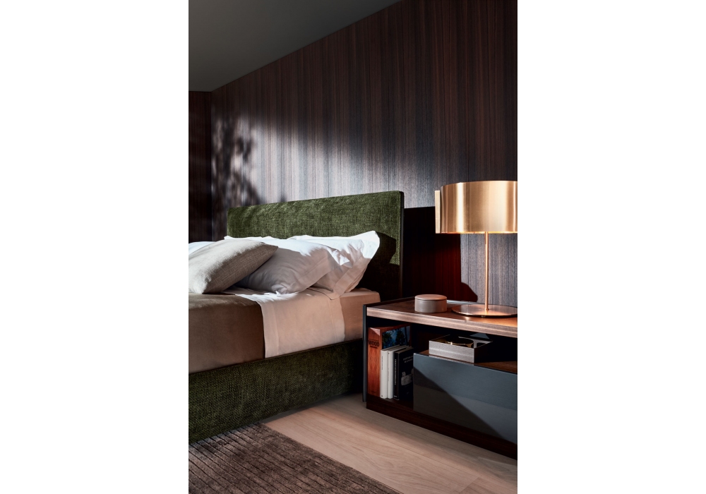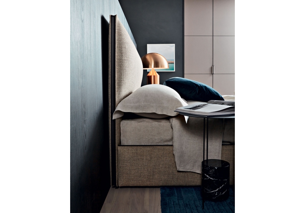 Ribbon diseñada por Vincent Van Duysen para Molteni&C es una cama con estructura de cabecera en madera contrachapada con relleno de espuma de poliuretano de densidad variable. Revestimiento en tela o piel con detalles en piel, que recorren todo el perímetro del cabecero y la estructura de la cama.