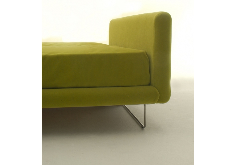 Avalon Bed designed by Eero Koivisto for Living Divani is an upholstered bed, with slatted base and satin stainless steel frame, featuring a sleek design made up of sinuous contours. Bed with headboard and bedstead structure in double-panelled poplar and pine padded in differentiated density polyurethane foam. Covering in needle punched, resinated, nonwoven polyester fibre, bonded onto a polyamide velveteen backing. Base in AISI 304 stainless steel tube, with matt satin-finish. Black lacquered metal frame for bed assembly and slat base support. Fabric or leather upholstery, both fully removable by Velcro fastenings. Fabric cover to protect the slat base, in 100% cotton, col. Ecru, fixed to the bedstead upholstery by zippers to open it on the sides and allow to inset the slat base.
