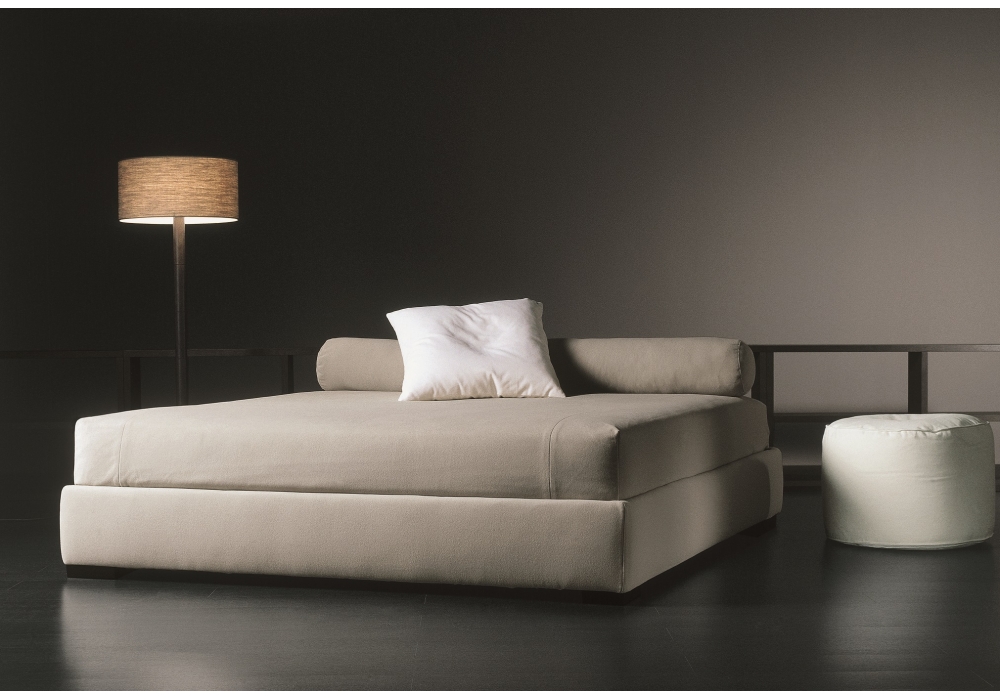 Derek diseñado por Andrea Parisio de Meridiani es una cama acolchada con funda desenfundable y revestimiento fijo para versión en piel. Estructura en madera desmontable con travesaño central en metal. Patas de madera teñida black, light y almond.