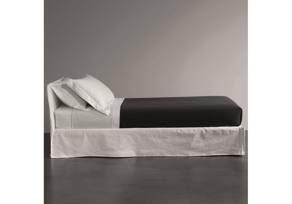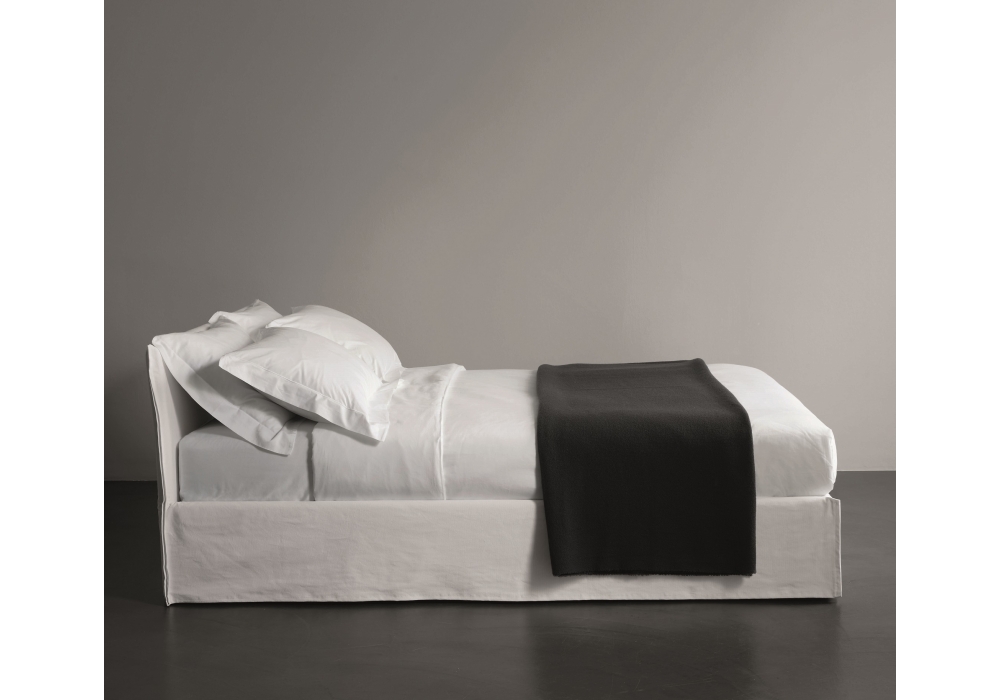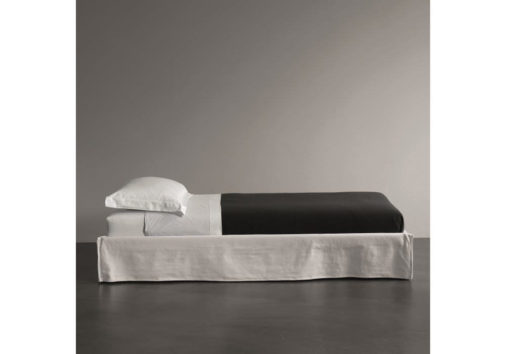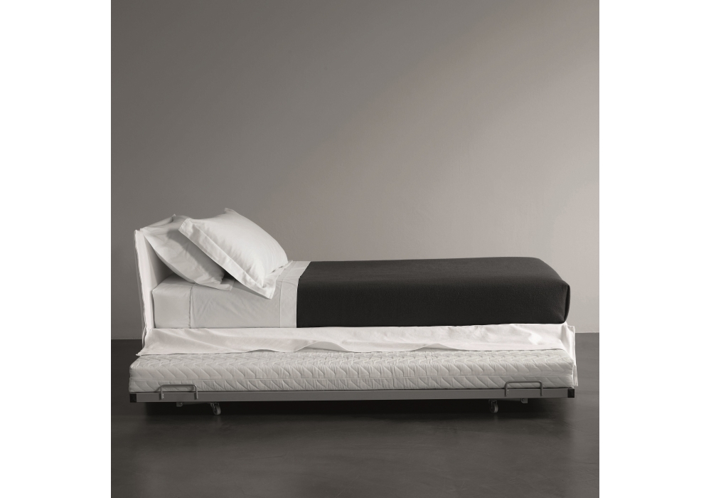 Fox diseñado por Andrea Parisio de Meridiani es una cama acolchada con funda desenfundable. Estructura desmontable en madera y metal, somier de láminas y marco portante en metal y relleno en poliuretano indeformable.