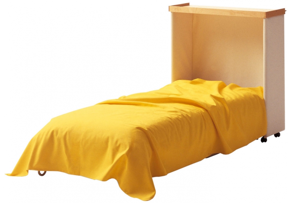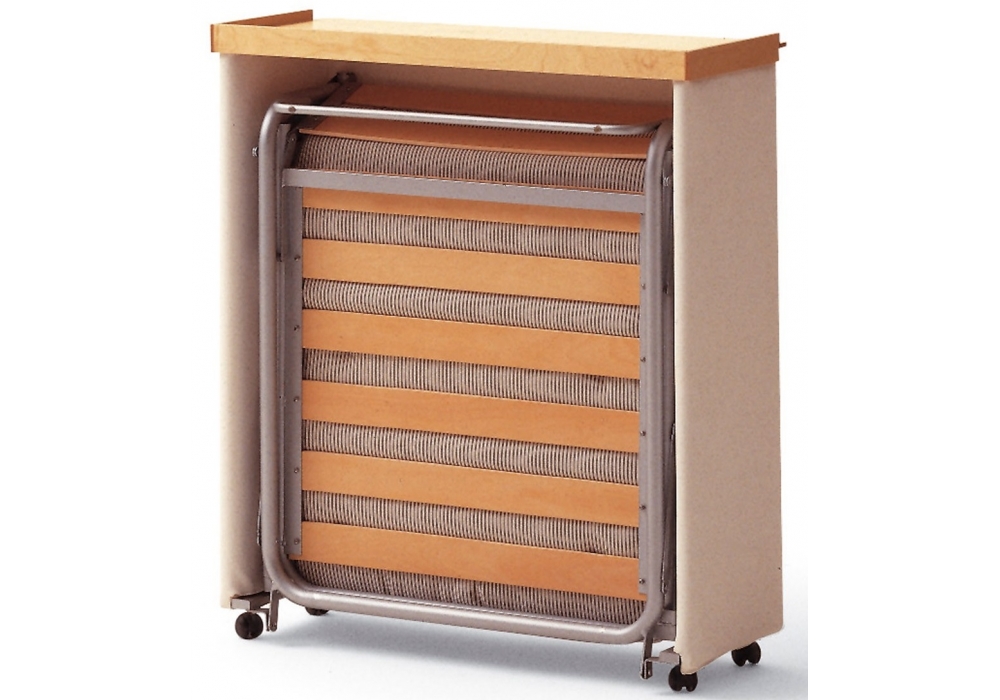Moby diseñada por Campeggi es una cama plegable con revestimiento desmontable disponible en diferentes colores y una base en madera de abedul pulido. Colchón en espuma de poliuretano, estructura de acero y listones de madera con amortiguadores de resina.