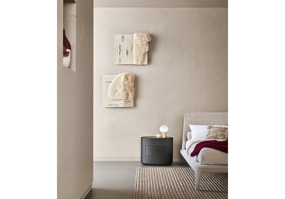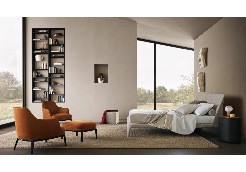 Kelly diseñada por Emmanuel Gallina para Poliform es una cama compuesta por somier con relleno de poliuretano flexible monocapa, pies de poliuretano compacto, con pretapizado en fibra de poliéster. Revestimiento en tejido o piel.