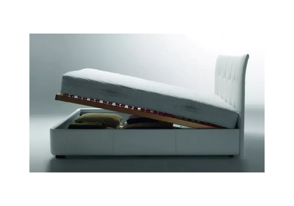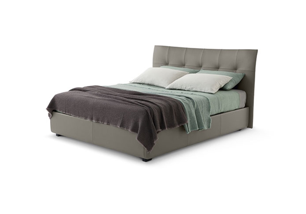 Aurora Due diseñada por Tito Agnoli para Poltrona Frau es una cama con contenedor. Cabecero en madera maciza de haya y patas cilíndricas en metal negro. Revestimiento en cuero Pelle Frau disponible en diferentes acabados. Cabecero trasero en tela o cuero. Disponible con dos tipos de mecanismo de elevación.