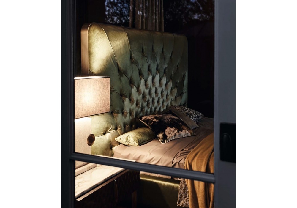 Vertigo diseñada por Castello Lagravinese Studio para Opera Contemporary es una cama con un elegante cabecero capitoné y estructura de metal que la rodea, disponible en diferentes acabados. Tapicería no desenfundable en tejido o piel. Base y colchón no incluidos.