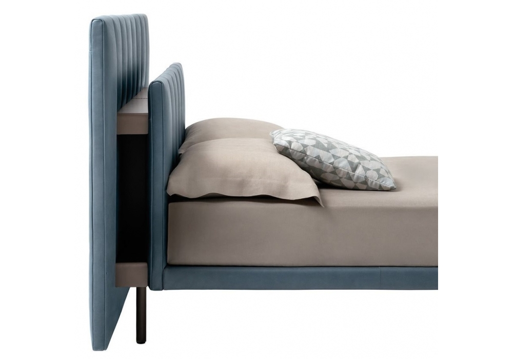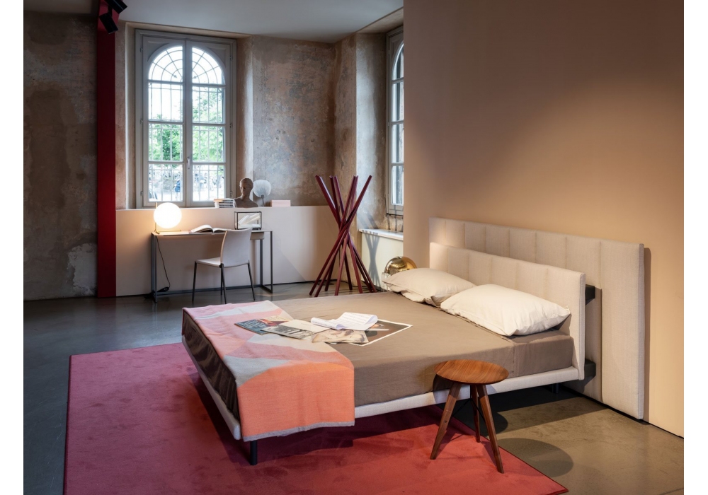 1879 Grangala diseñada por Gabriele Rosa para Zanotta es una cama alta con cabecera acolchada con revestimiento en tejido o piel. Lamas de haya curvados, barnizados naturales. Patas y estantes en acero revestidos en cuero pigmentado 90. Disponible en diferentes tamaños.