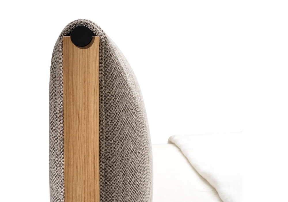1862 Ricordi diseñada por Spalvieri & Del Ciotto para Zanotta es una cama con estructura de cabecero en roble natural o pintado a poro abierto. Patas delanteras y varilla superior del cabecero en acero barnizado negro mate. Funda desenfundable en tejido o piel. Base de acero con listones de haya curvada natural (6,8 cm de ancho).