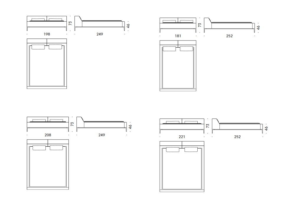 | Dimensiones | 198 x 249 x H 73 cm; 208 x 249 x H 73 cm; 181 x 252 x H 73 cm (Queen size); 221 x 252 x H 73 cm (King size). |