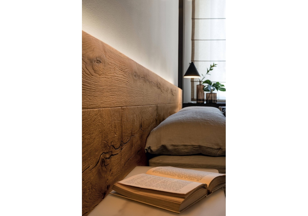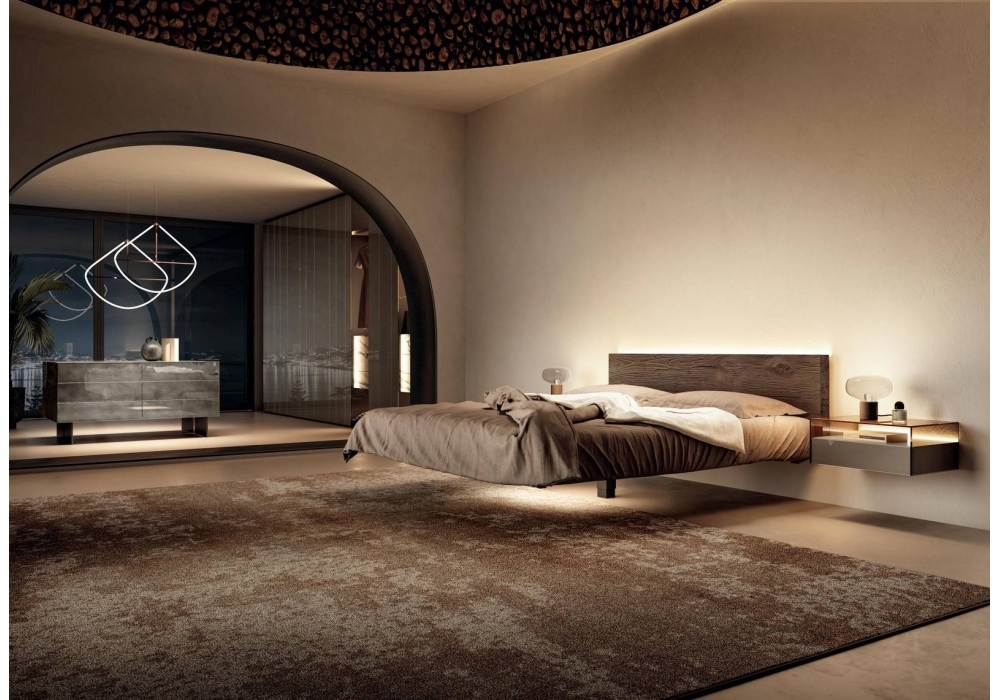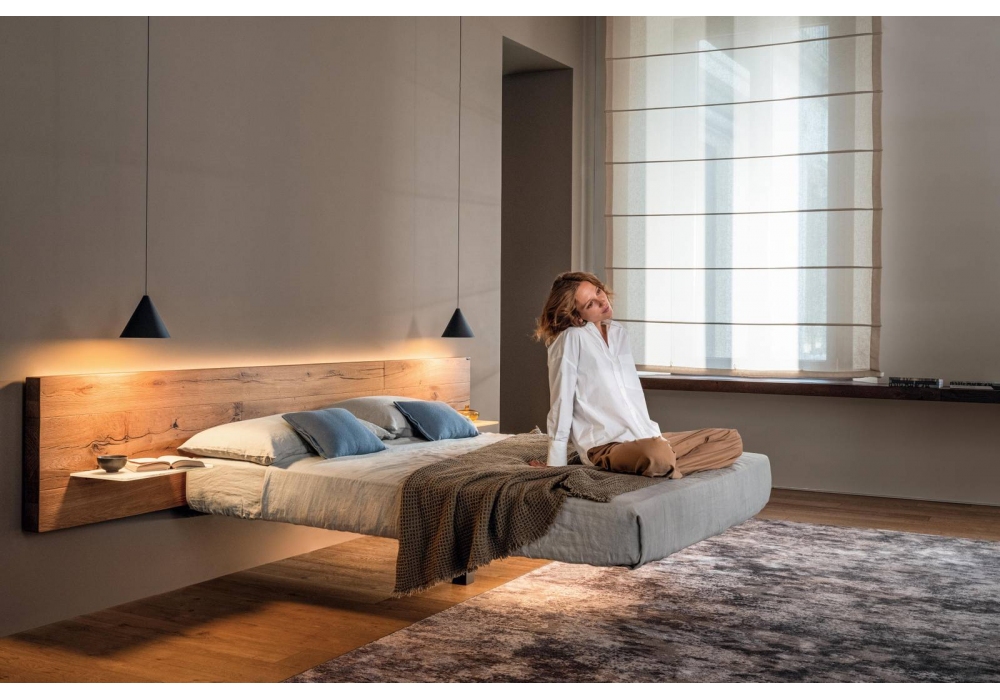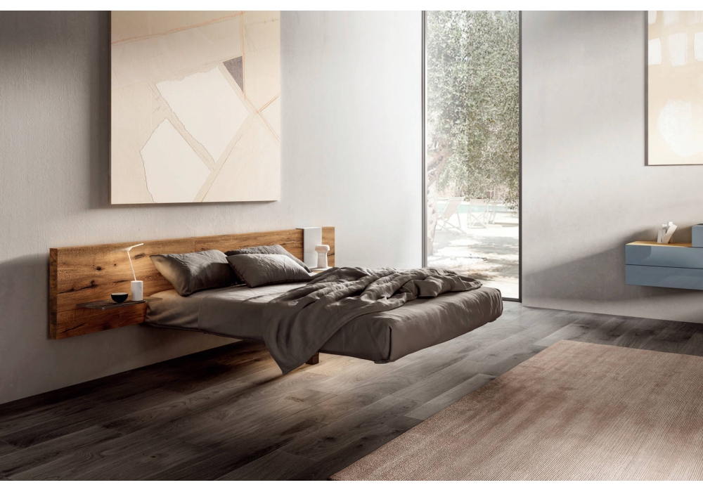 Fluttua diseñada por Daniele Lago es una cama suspendida en un solo pivote central. El cabecero es de madera con acabados Wildwood, Agewood o Haywood. La cama es regulable en altura antes de ser fijada a la pared. Disponible en diferentes acabados y medidas.