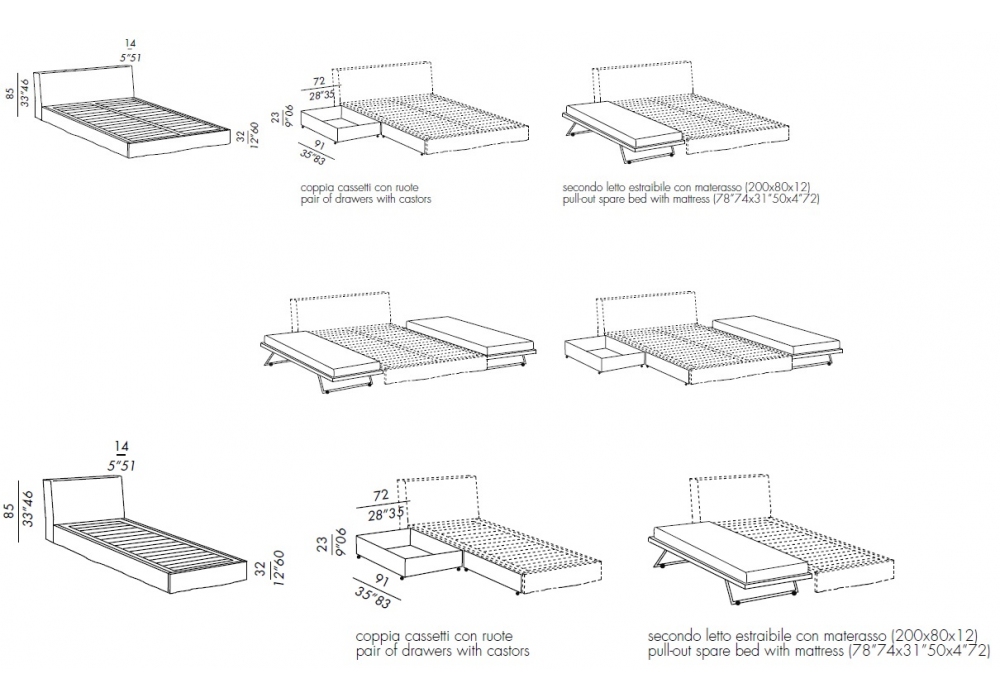 Law diseñado por Andrea Parisio de Meridiani es una cama acolchada con perfil en tela, estructura desmontable en madera y metal, somier de láminas y marco portante en metal. Disponible con los siguientes accesorios bajo pedido: pareja de cajones extraíbles con ruedas, segunda cama extraíble (somier a láminas y marco en metal con patas plegables y ruedas).