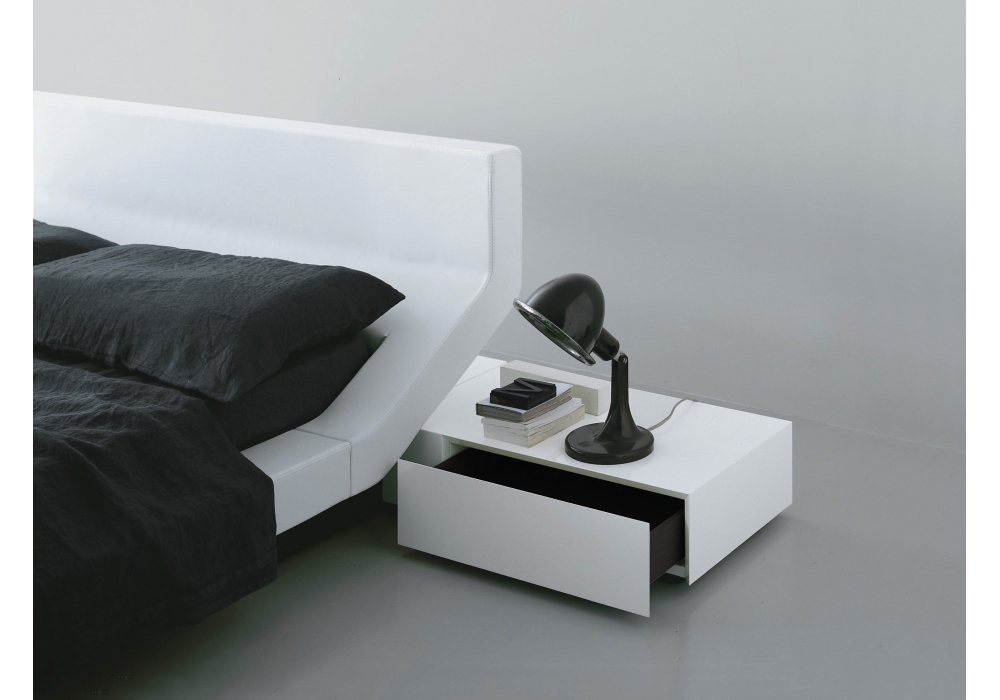 Lipla diseñada por Jean Marie Massaud para Porro es una cama compuesta por un somier de madera maciza superpuesto con tejido, piel o ecopiel; cabecero de madera contrachapada con revestimiento de tela, cuero o ecopiel; Respaldo de panel de partículas de densidad media en laca brillante que se puede utilizar como superficie de apoyo y mesita de noche con cajones.