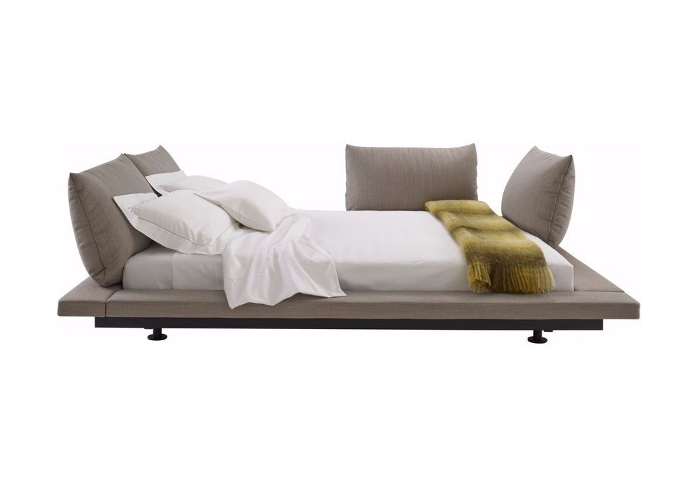Peter Maly 2 diseñada por Peter Maly para Ligne Roset es una cama con estructura en perfiles de aluminio anodizado negro. Paneles laterales en tablero de partículas de 3 capas revestido de espuma de poliuretano y acolchado de poliéster. Patas cilíndricas con placa de acero lacado negro mate - a elegir entre dos alturas: 10 cm o 16 cm. La estructura de la cama admite todo tipo de somieres y colchones. Revestimiento en tejido o piel. Los cojines removibles con fijaciones metálicas se pueden colocar en cualquier punto alrededor de la cama. Cojines en espuma Bultex de poliuretano de alta densidad con núcleo de acero y suspensión integral de tejido elástico. Disponible en diferentes medidas.
