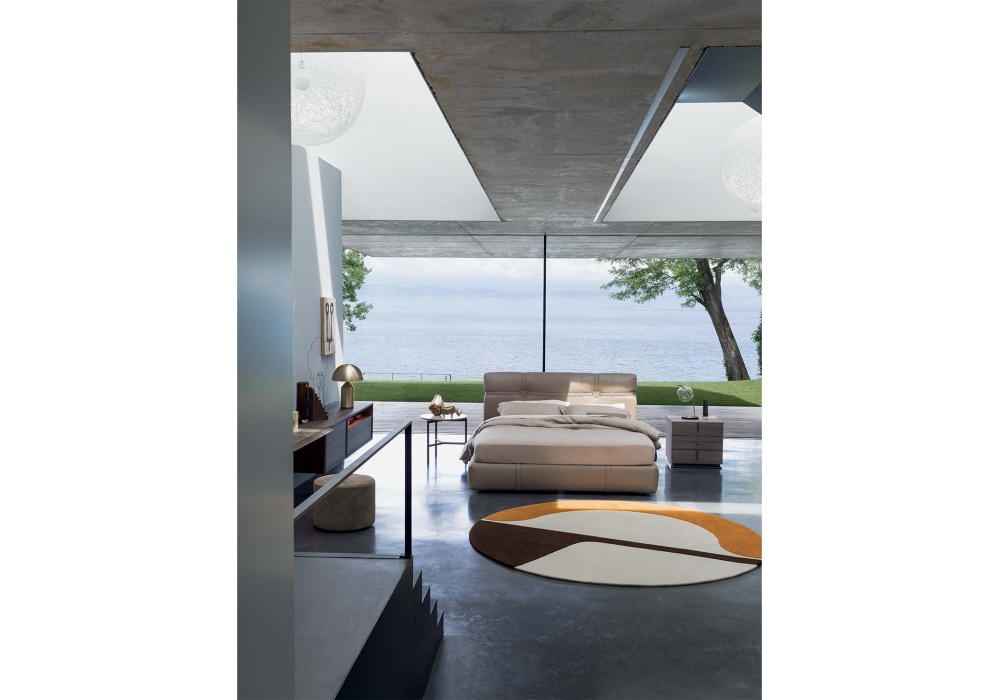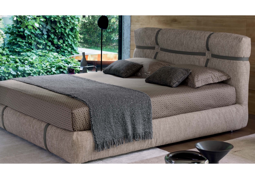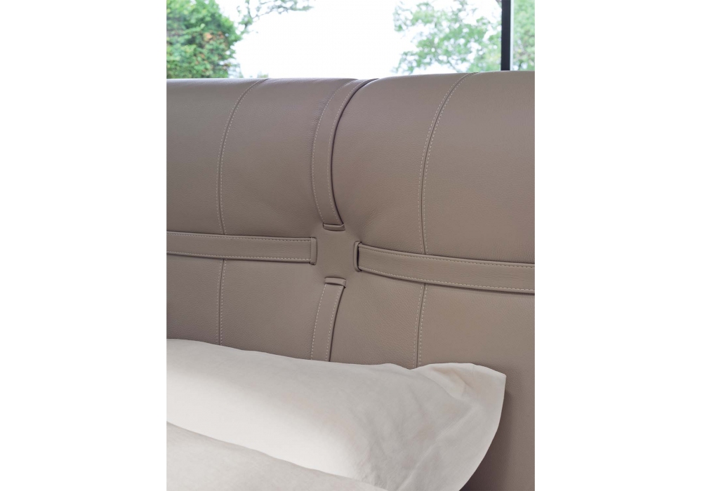 New Bond diseñada por Matteo Nunziati para Flou es una cama tapizada que se puede cubrir en piel o tejido. Esta cama cuenta con cintas de piel. Disponible con base de muelles Leonardo, base contenedor, base fija o base con movimiento eléctrico.