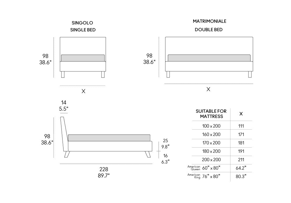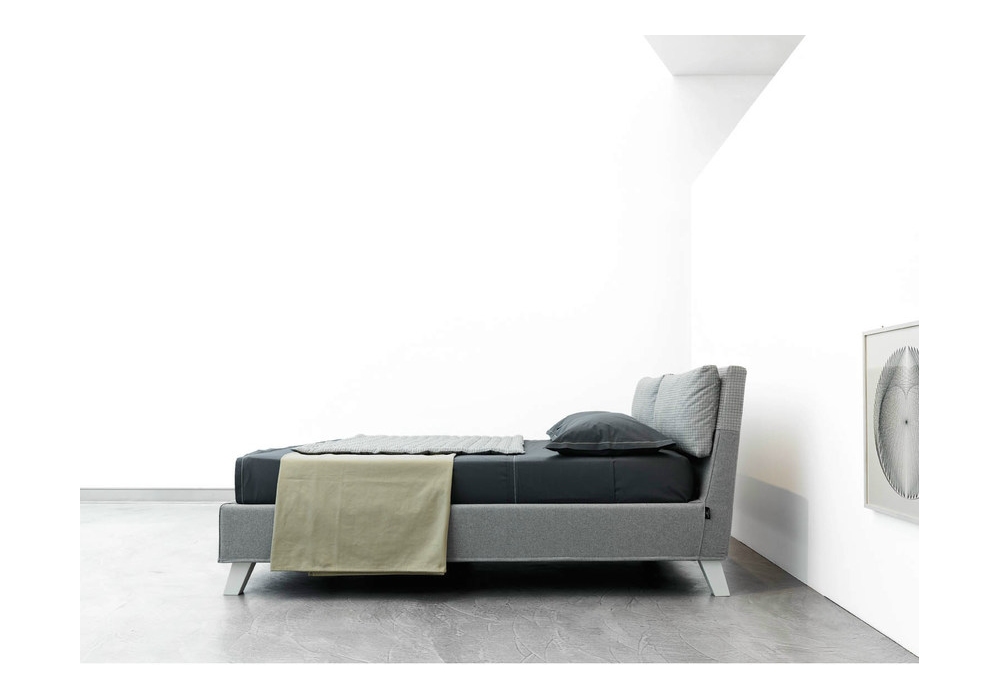 Bahamas diseñada por Orizzonti Design Center para Casamania & Horm es una cama acolchada con revestimiento desenfundable en tela, piel o ecopiel. Somier fijo de lamas, somier exterior del colchón y pies en madera de haya incluidos en el precio. Disponible en diferentes dimensiones.