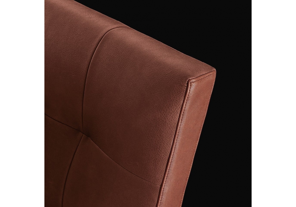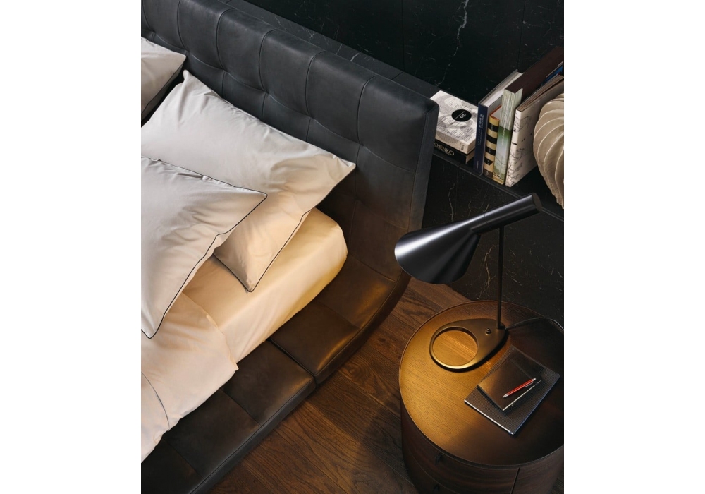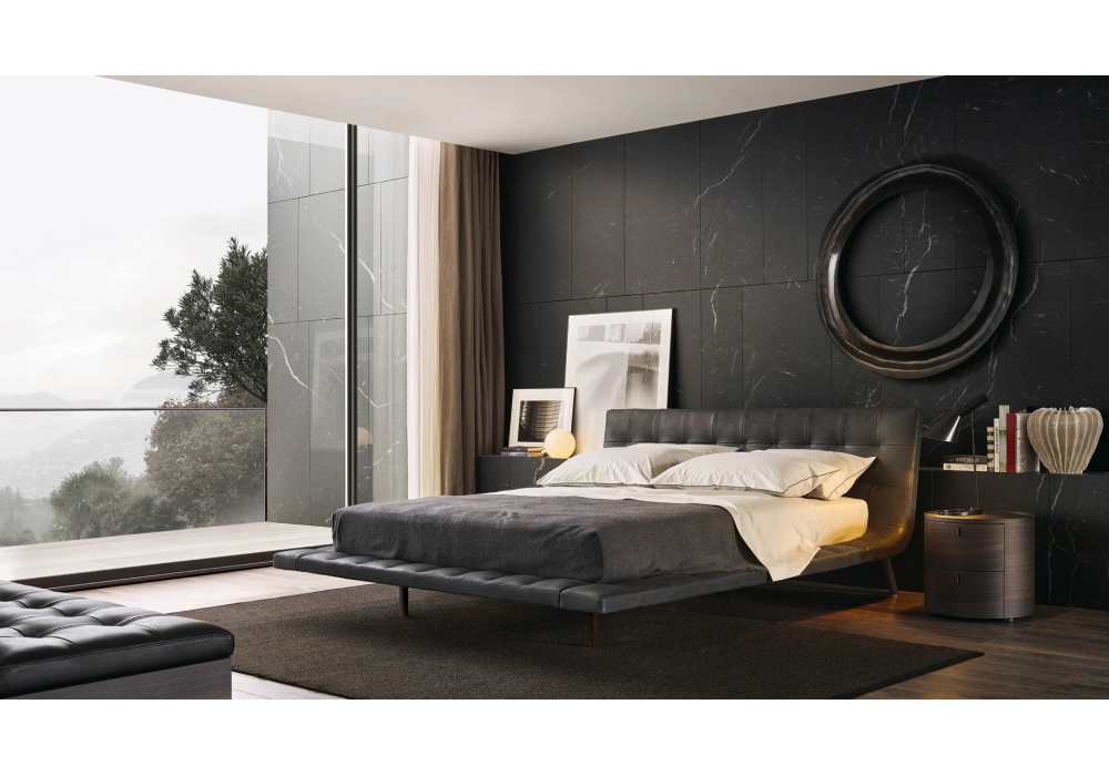 Onda diseñada por Paolo Piva para Poliform es una cama con estructura de poliuretano flexible moldeado en una sola pieza con pre-revestimiento en fibra de poliéster. Patas de metal pintado níquel marrón mate y revestimiento de piel.