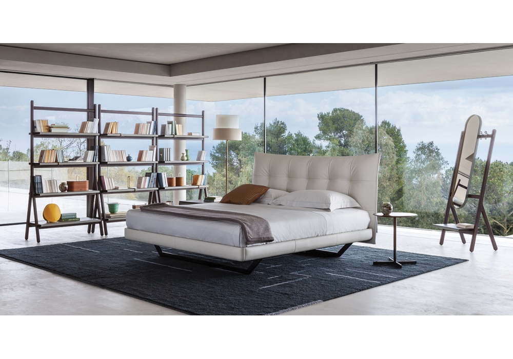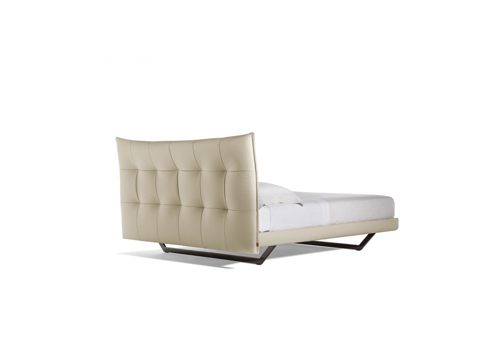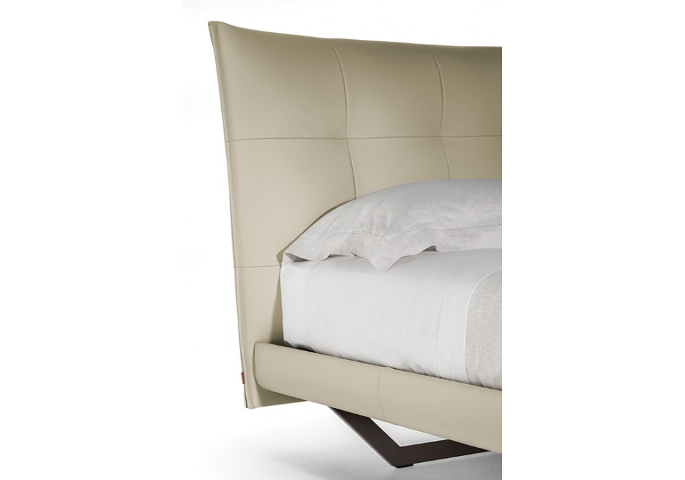 Aurora Tre diseñada por Tito Agnoli para Poltrona Frau es una cama con estructura de cabecero en contrachapado de abedul y relleno de MDF, acolchado con espuma de poliuretano de diferentes densidades y guata de poliéster. Base ligeramente acolchada de espuma de poliuretano con estructura de listones de abeto y piecero de contrachapado de álamo. Dos pies de forma trapezoidal que recorren todo el ancho de la cama y están retranqueados respecto al pie de cama. La cama está disponible con tapicería de cuero o tela.