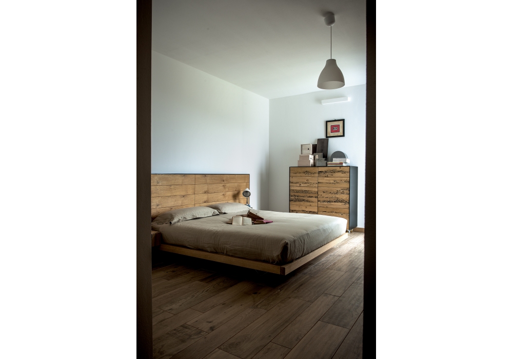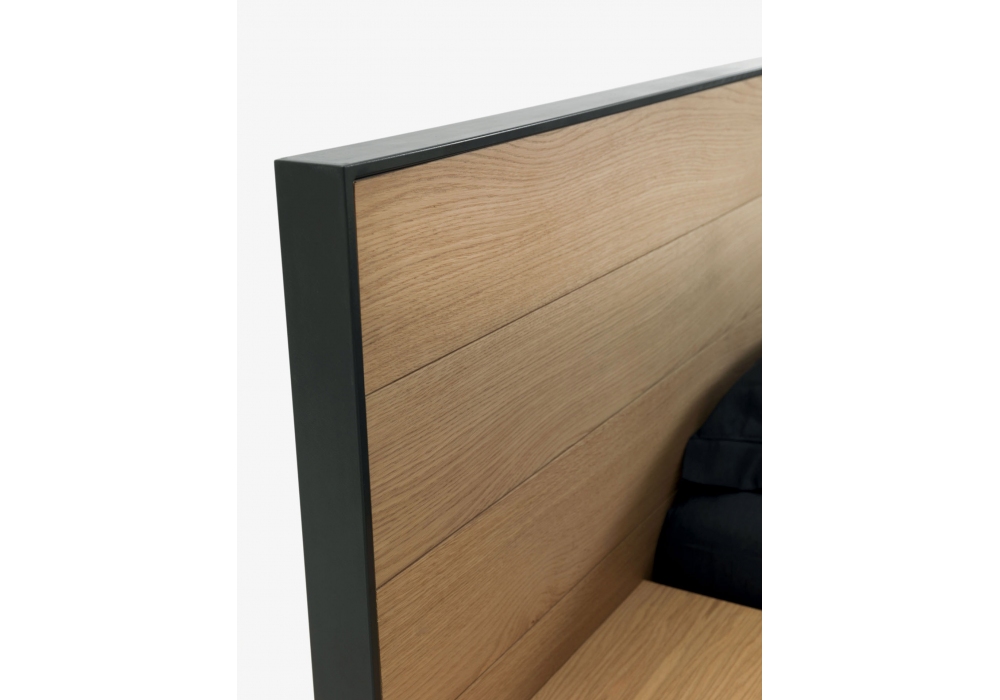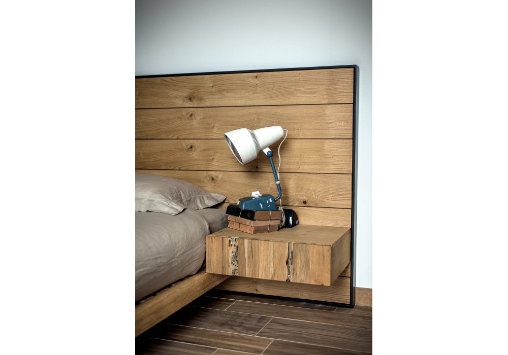 Rialto Bed diseñada por Giuliano Cappelletti para Riva 1920 es una cama en madera contrachapada de blockboard compuesta por una cabecera enmarcada por una estructura de hierro y un somier de madera maciza, con mesitas de noche integradas.