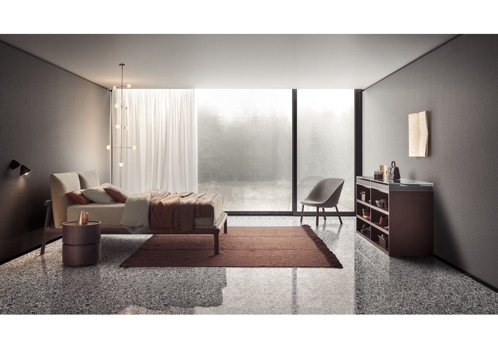 Fushimi diseñada por Philippe Tabet para Pianca es una cama con estructura realizada en madera maciza de nogal acabado Canaletto o en fresno macizo barnizado o lacado Essenza. Cojín de cabecero con estructura interna de paneles de tableros de partículas acolchados con espuma de poliuretano. Revestimiento desenfundable está hecha de tela, cuero o cuero sintético.