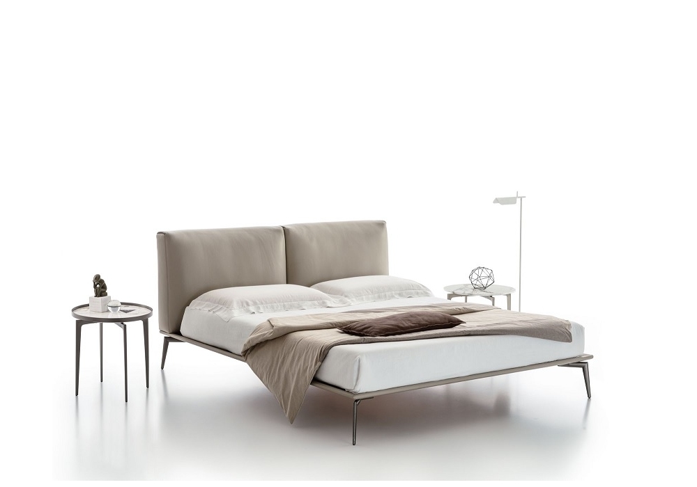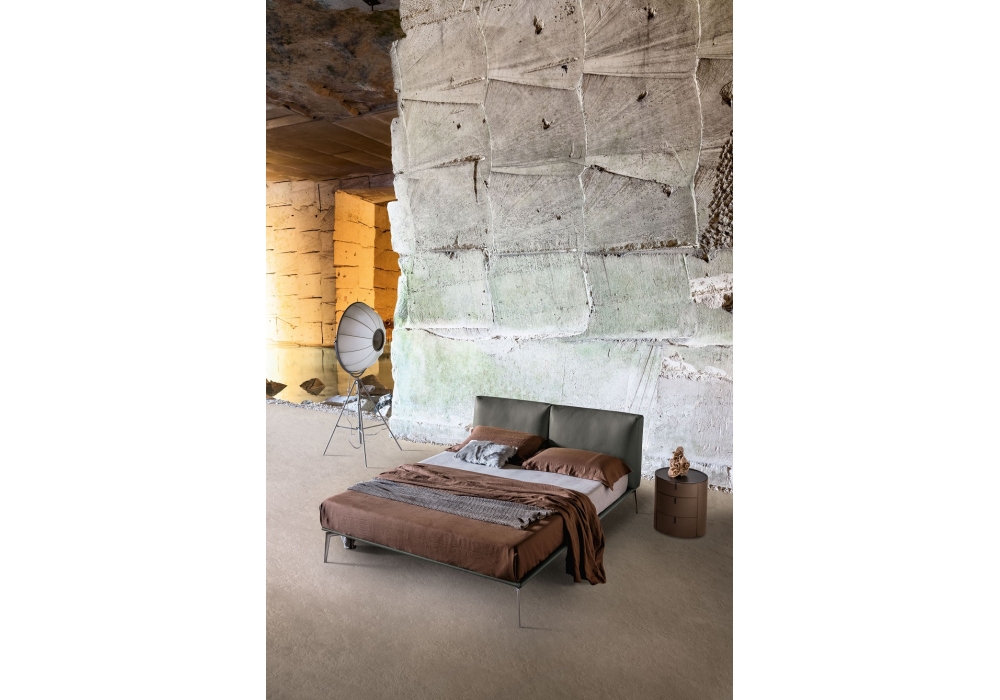 Papillon diseñada por Giuseppe Bavuso para Alivar es una cama realizada con un cabecero de acero y madera con acolchado de espuma de poliuretano de densidad diferenciada y forro de fibra de poliéster. Estructura de la cama en acero y madera recubierta de espuma de poliuretano y forro de fibra de poliéster. Pies en fundición de aluminio pulido o pintado y revestimiento en piel o tela. Bajo pedido somieres con lamas de haya.
