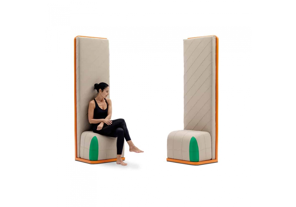 Twin diseñada por Matali Crasset para Campeggi es una pareja de asientos con estructura en metal pintado de naranja y tapizado removible en lycra de color. Se convierte de asiento a cama con mesita de noche.